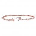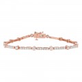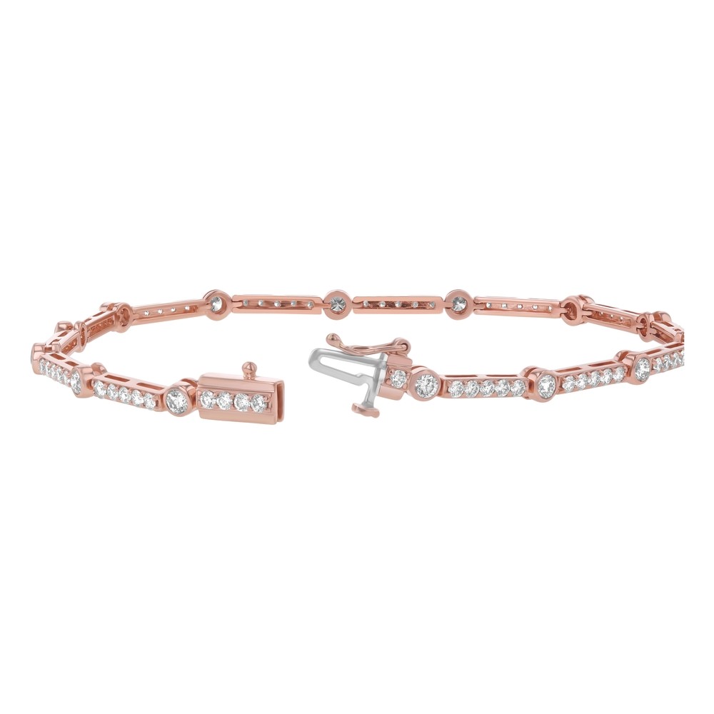 14K Rose gold tennis bracelet set with 2.10ct. round diamonds secured in bezel setting. The bracelet is 7.25 inch long and feature box clasp with eight figure safety.