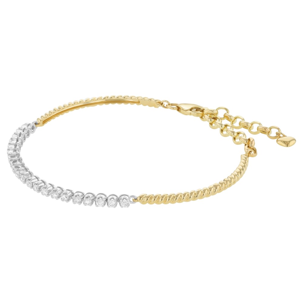 14K two tone yellow and white gold adjustable length bracelet set with 0.75 ct. round diamonds and featuring two braided curved side bars for better wrist wrap. The bracelet is secured with lobster clasp and adjustable up to 7.5 inch.