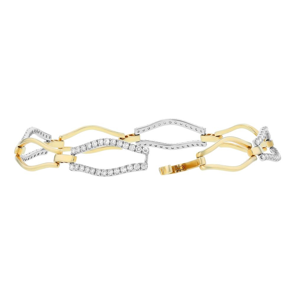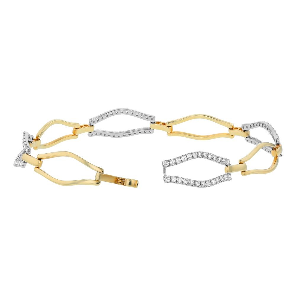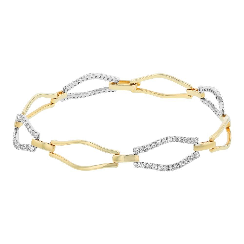 14K two tone yellow and white gold bracelet set with 1.25 ct. Diamonds. The bracelet is 7.25 inch long and locks with fold over clasp.
