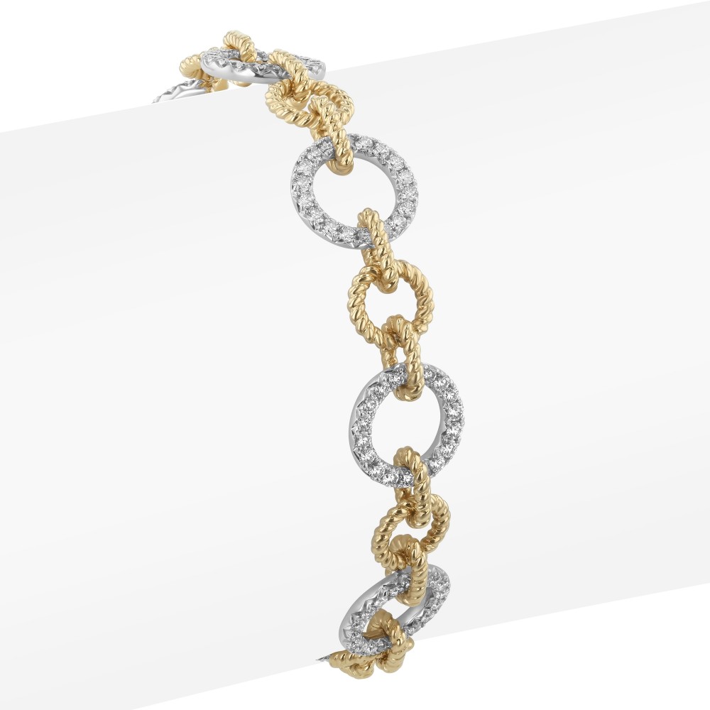 14K two tone yellow and white gold bracelet set with 5.5 ct. diamonds on both sides of the diamond circles and adorned with fancy braided links. The bracelet is 7 inch long and locks with double fold over safety lock.