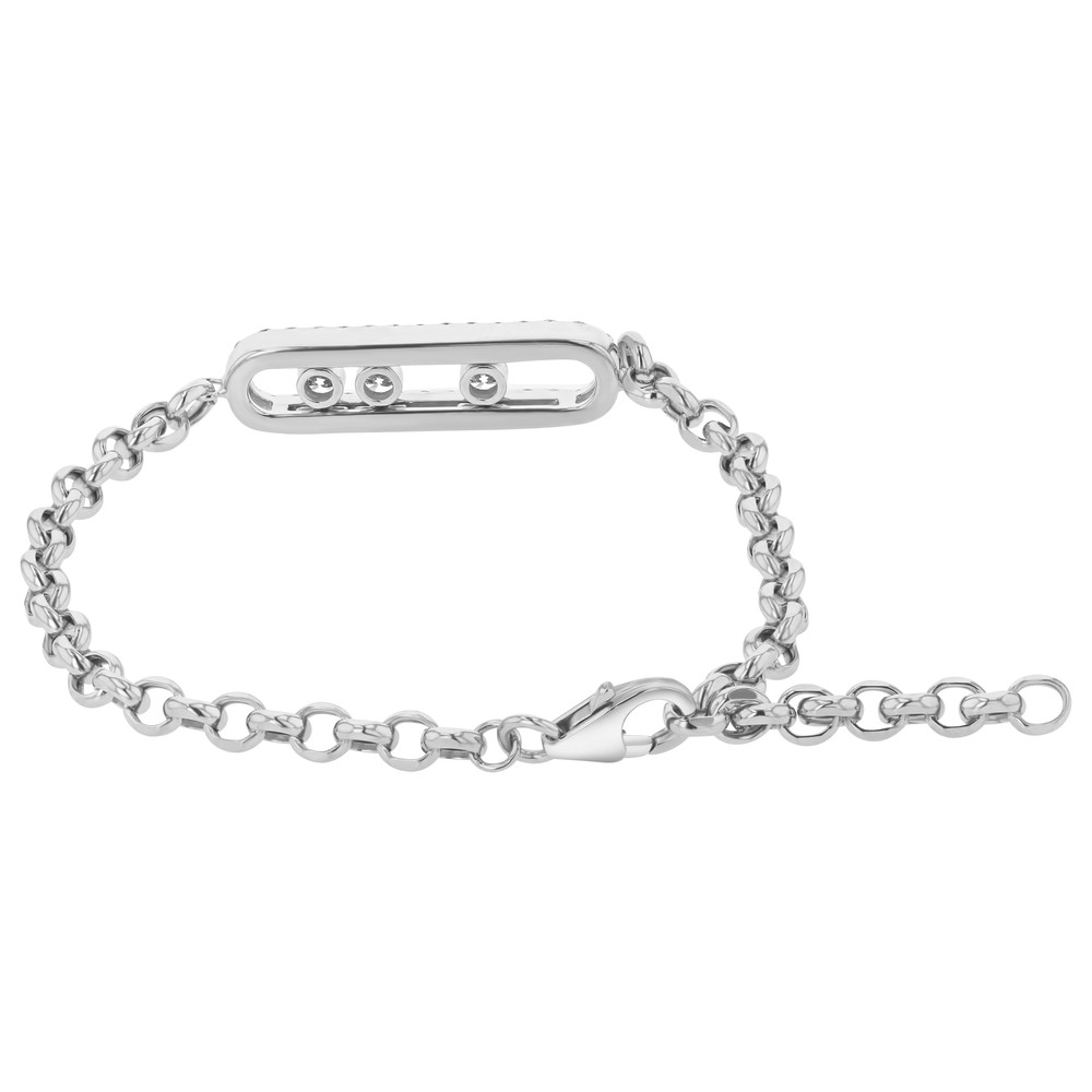 14K white gold adjustable length elongated oval frame bracelet set with 1.10ct. round diamonds. The center diamonds slide inside the frame. The bracelet is secured with lobster clasp and adjustable up to 8 inch.