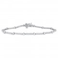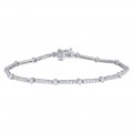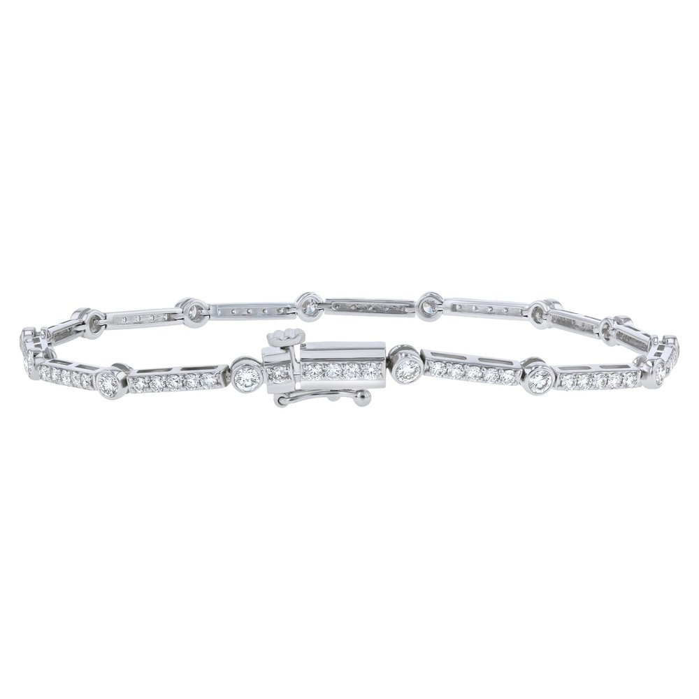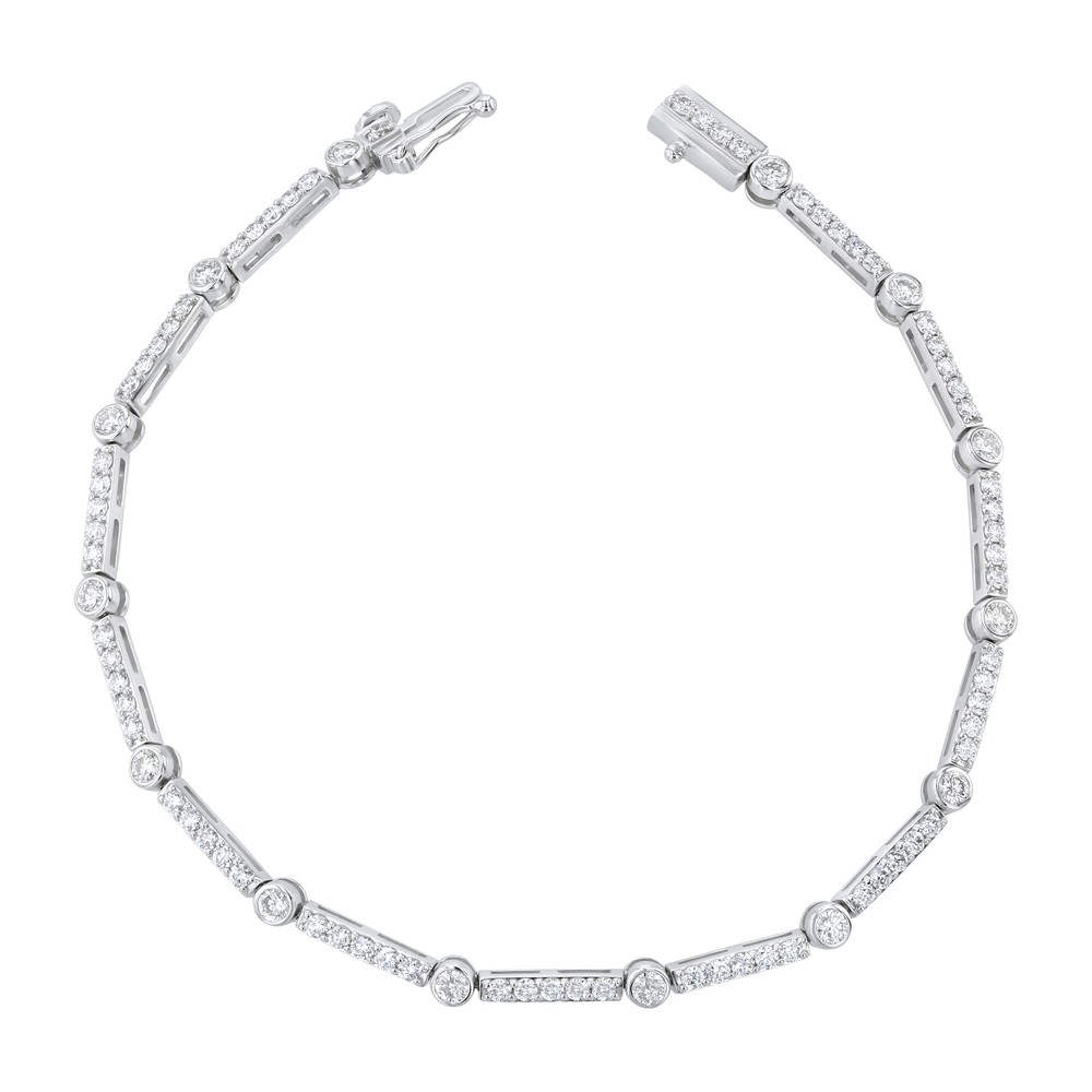 14K white gold tennis bracelet set with 2.10ct. round diamonds secured in bezel setting. The bracelet is 7.25 inch long and feature box clasp with eight figure safety.