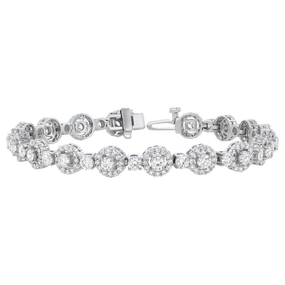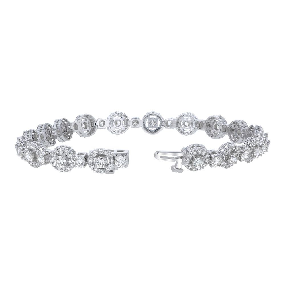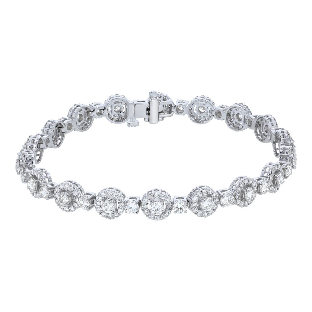 14K white gold tennis bracelet set with 6.8 ct. round diamonds in flower cluster design. The bracelet is 7.25 inch long and secured with box clasp with locking latch safety.