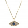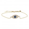 14K yellow gold EVIL EYE necklace set with 0.09 carat round brilliant diamonds and 0.04 carat blue sapphires. Bracelet has adjustable chain and measures up to 8 inch.