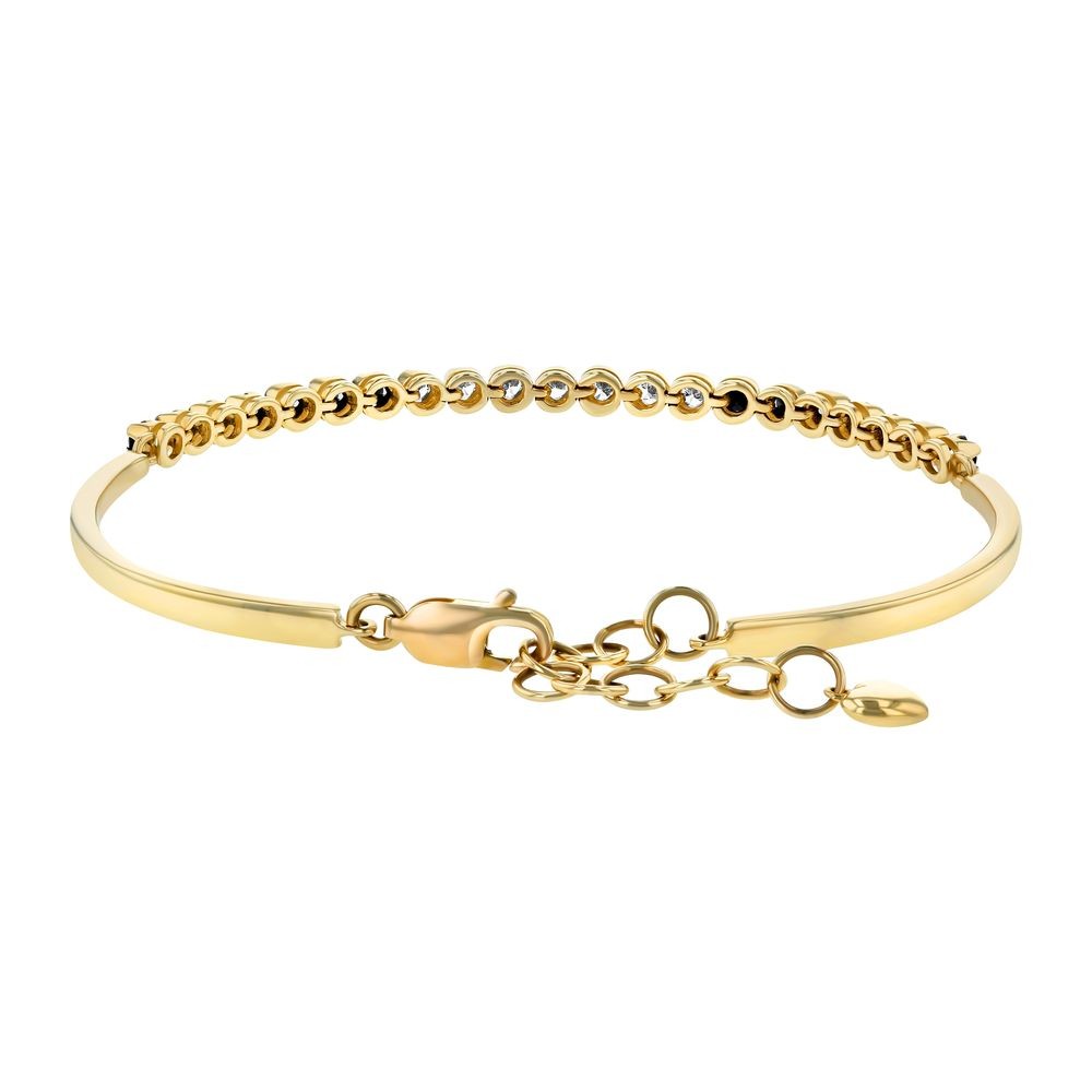 14K yellow gold adjustable length bracelet set with 0.75 ct. round black and white diamonds and featuring two curved side bars for better wrist wrap. The bracelet is secured with lobster clasp and adjustable up to 7.75 inch.