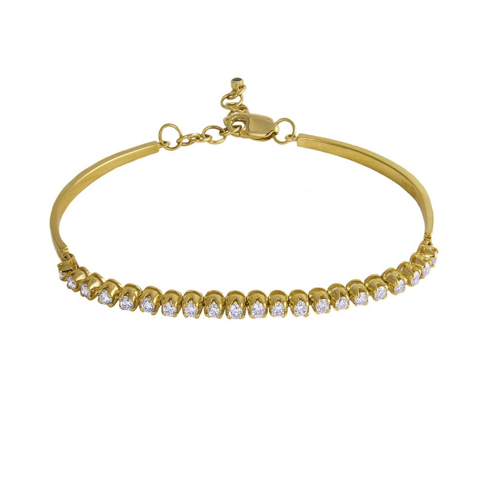 14K yellow gold adjustable length bracelet set with 0.75 ct. round diamonds and featuring two curved side bars for better wrist wrap. The bracelet is secured with lobster clasp and adjustable up to 8 inch.