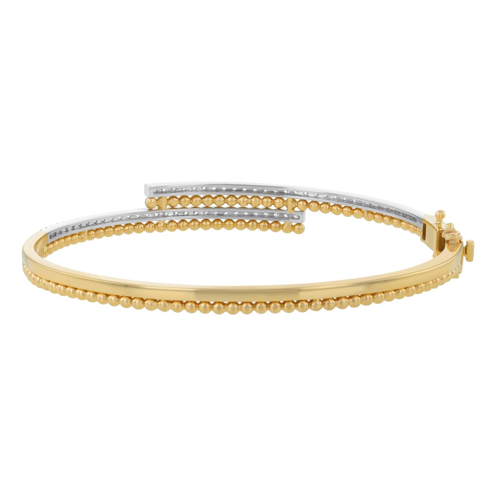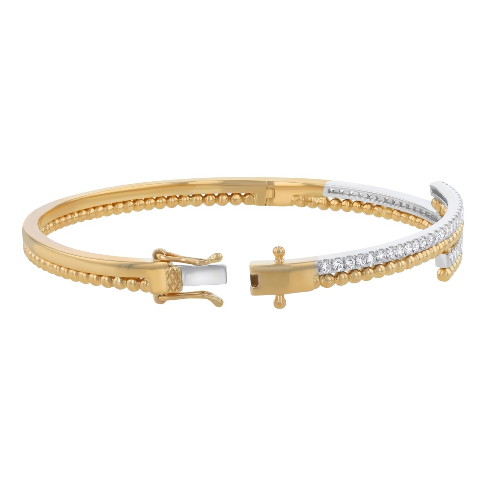 14K yellow gold bangle with 0.95ct. white round diamonds with bead detail and high polish finish. The bangle is secured with box clasp and eight figure safety.