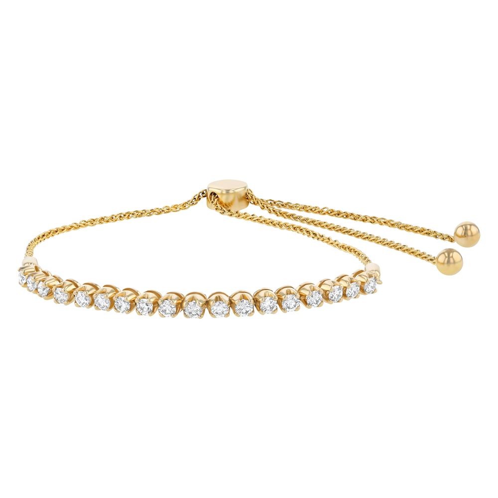14K yellow gold adjustable length bolo bracelet set with 1 ct. round diamonds and featuring wheat chain with sliding mechanism. The bracelet is adjustable up to 9.75 inch.
