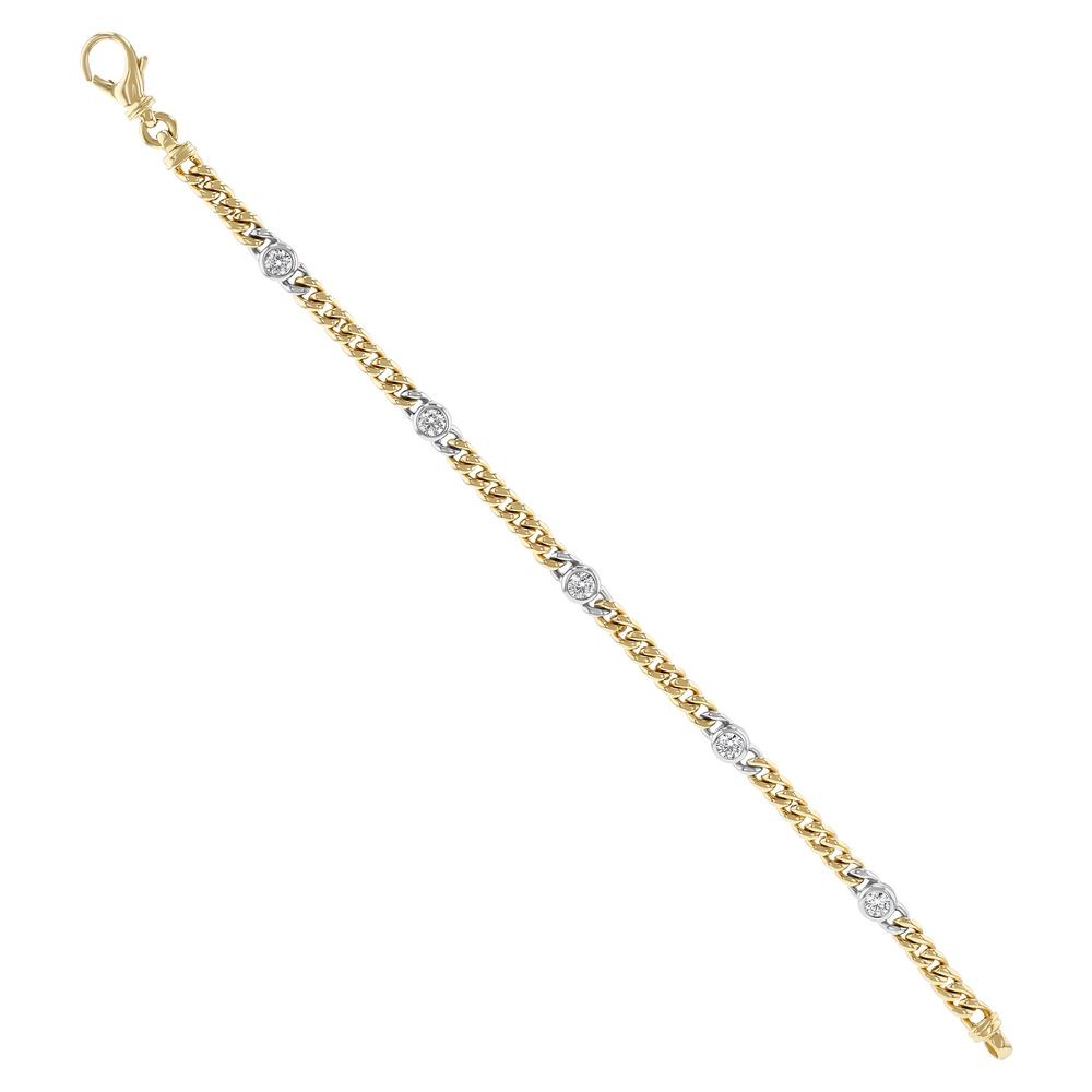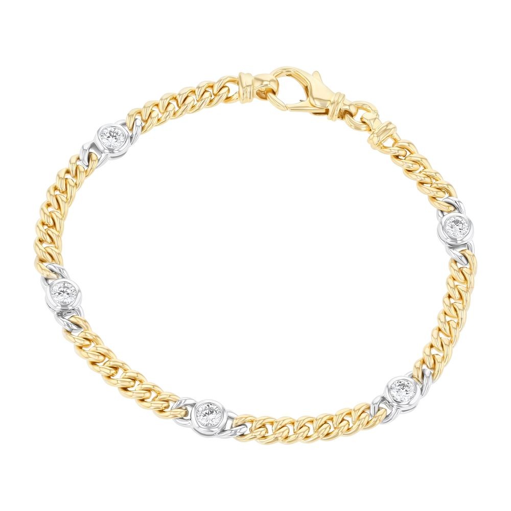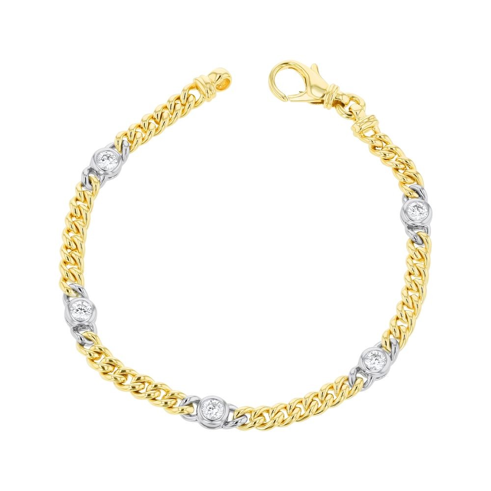 14K yellow gold curb link bracelet set with 5 diamonds total 1.0 ct. in white gold bezels. The bracelet weighs approx. 15 grams, 7.5 inch long and locks with lobster clasp.
