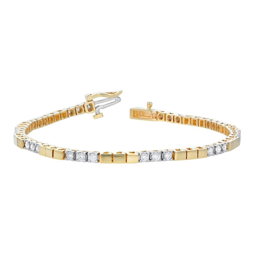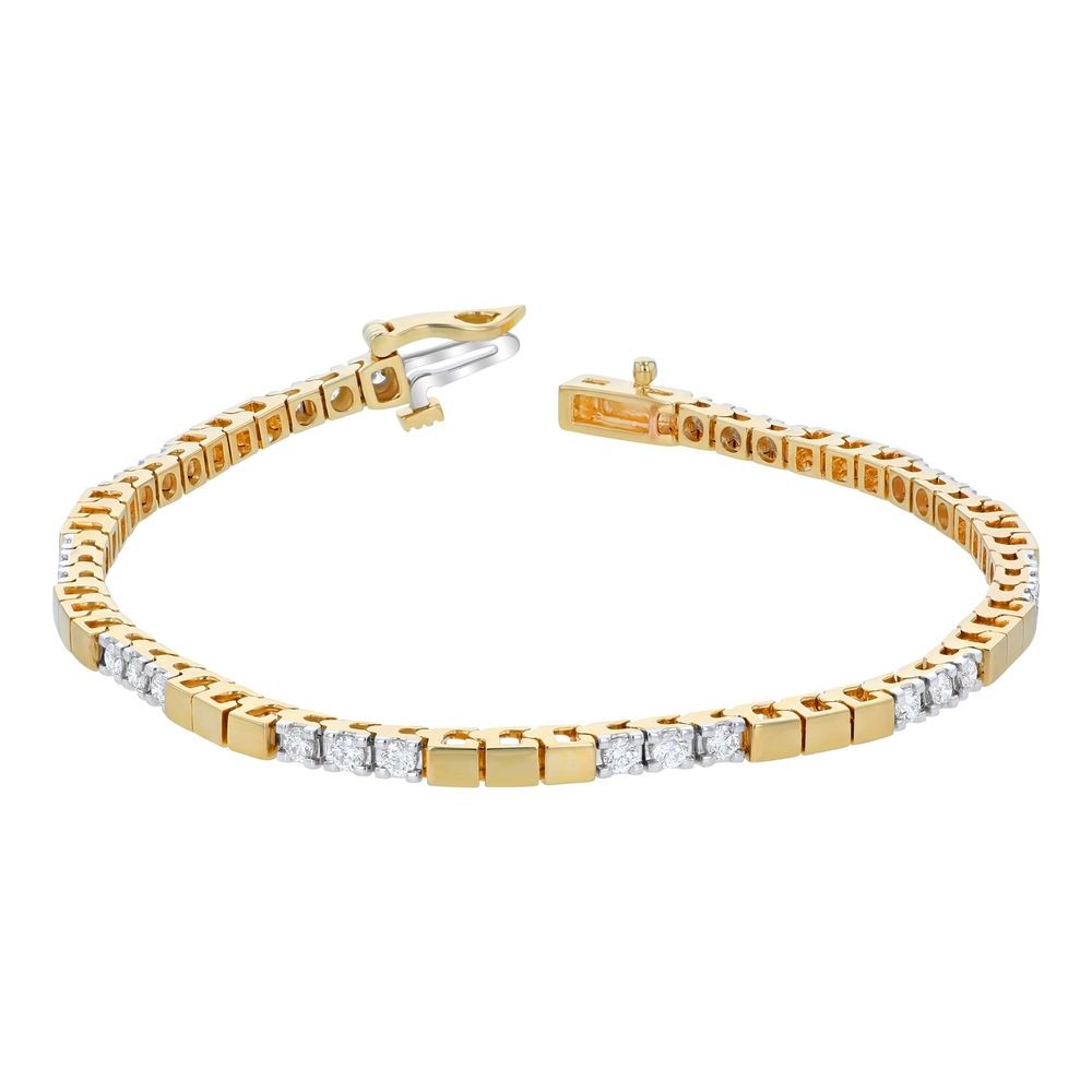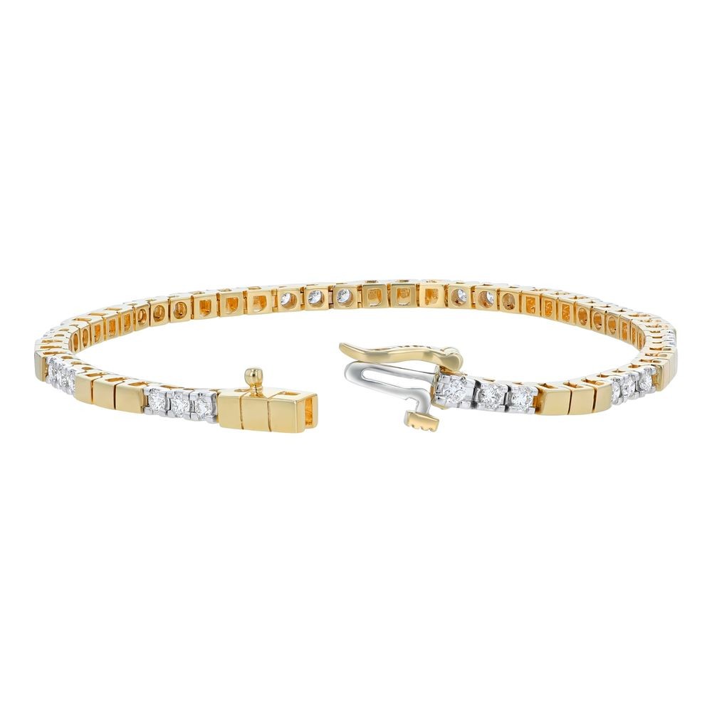 14K yellow gold tennis bracelet set with 1.0 ct. round diamonds secured in 4 prongs setting. The bracelet is 7 inch long and feature box clasp with eight figure safety.