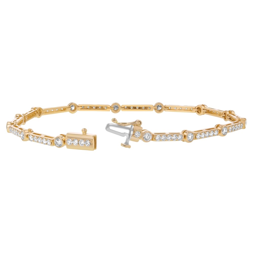 14K Yellow gold tennis bracelet set with 2.10ct. round diamonds secured in bezel setting. The bracelet is 7.25 inch long and feature box clasp with eight figure safety.