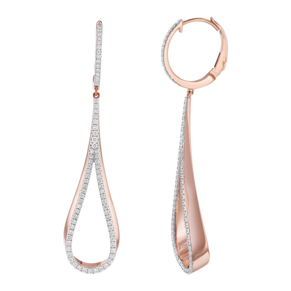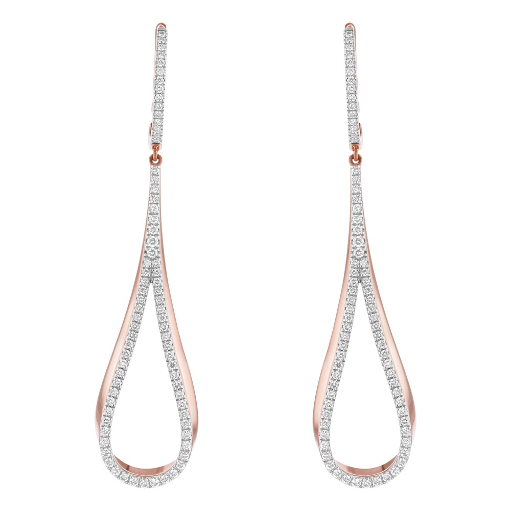 14K rose gold tear drop shape earrings set with 0.75 ct. round diamonds and dangling from hoops.