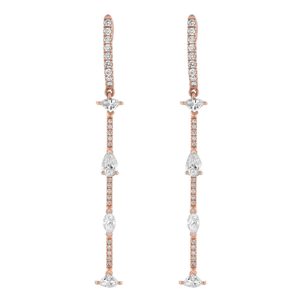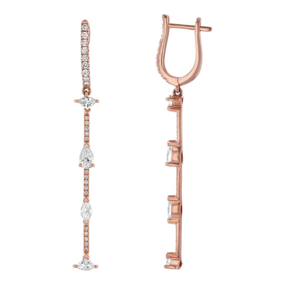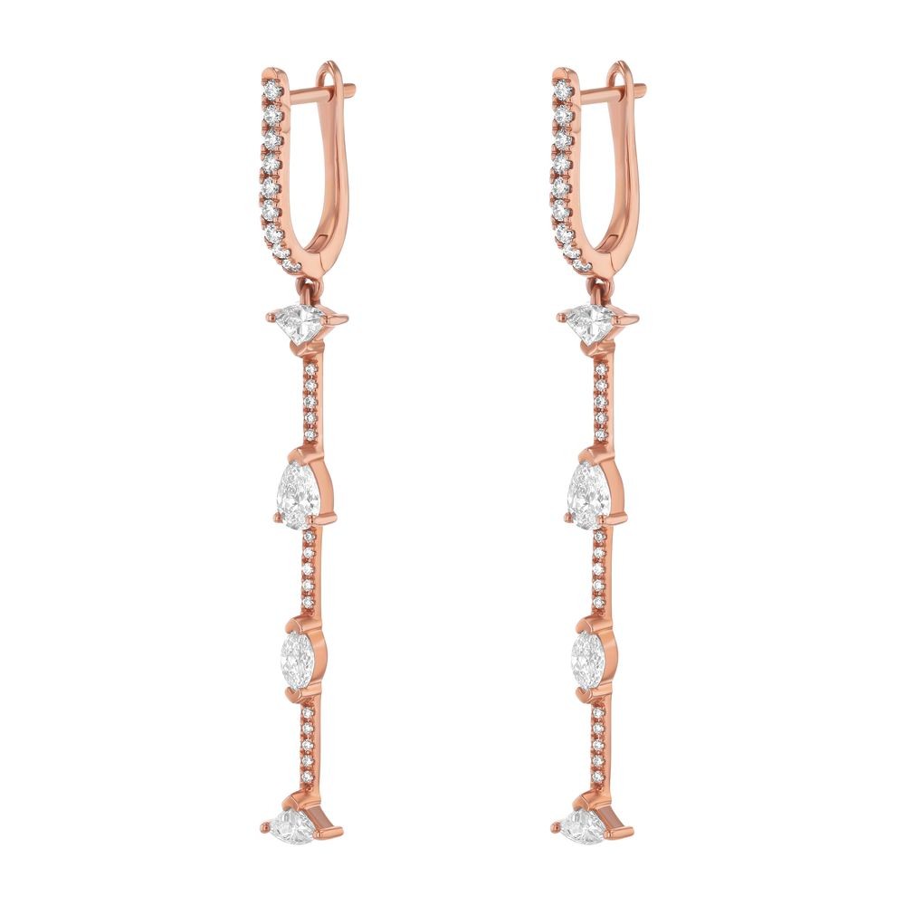 14K rose gold drop earrings set with 1.70 ct. marquise, pear, trillion and round diamonds in dangling sticks design.
