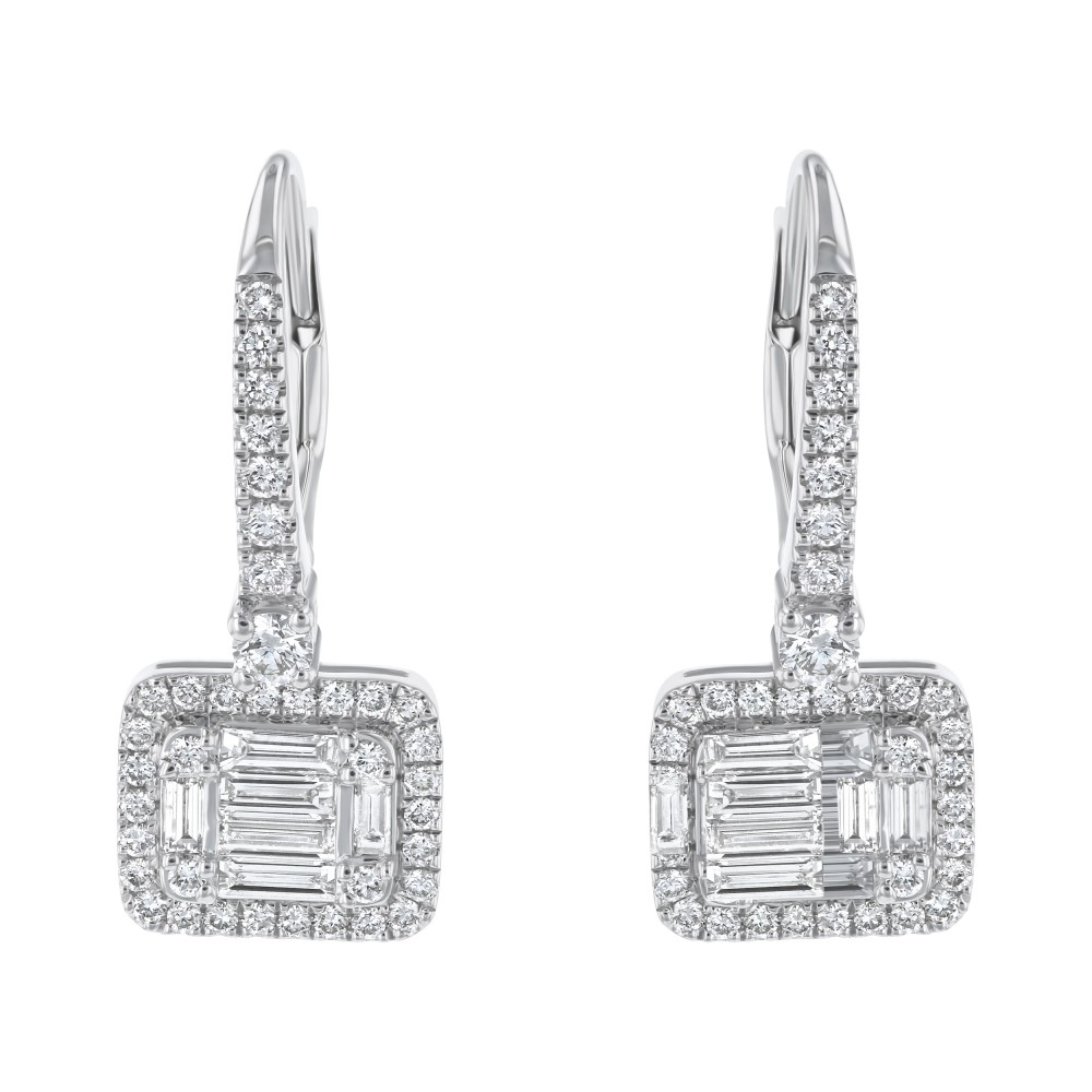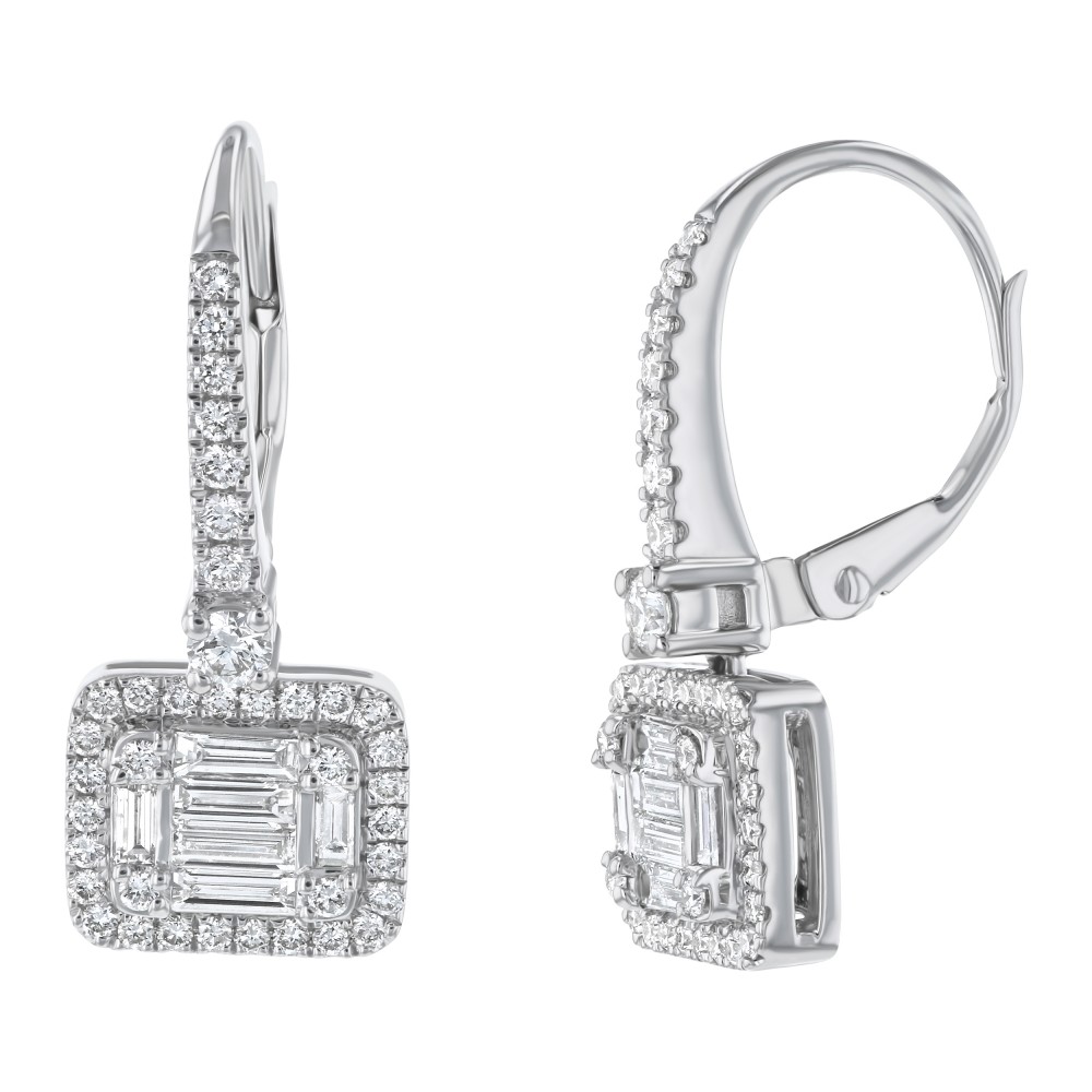 14K white gold rectangle shaped leverback earrings set with 1.25 carat baguette and round white diamonds.