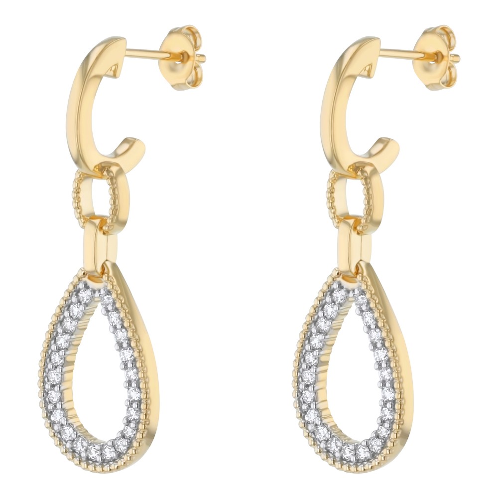 14K yellow gold pear shaped drop earrings set with 0.70 ct. white round diamonds and dangling from half hoops with post and pushback.