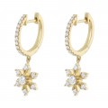 14K yellow gold drop earrings set with 0.70 ct. white round diamonds in snowflake design suspended from oval hoops.
