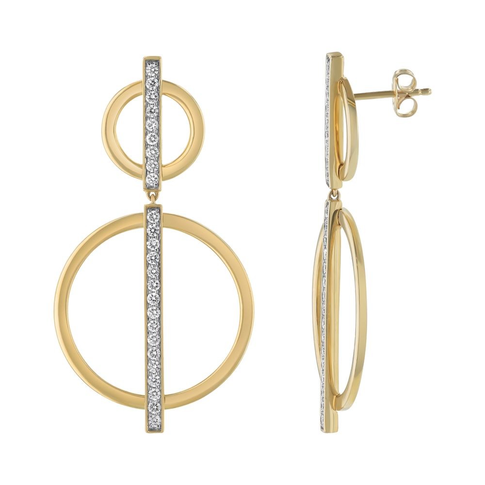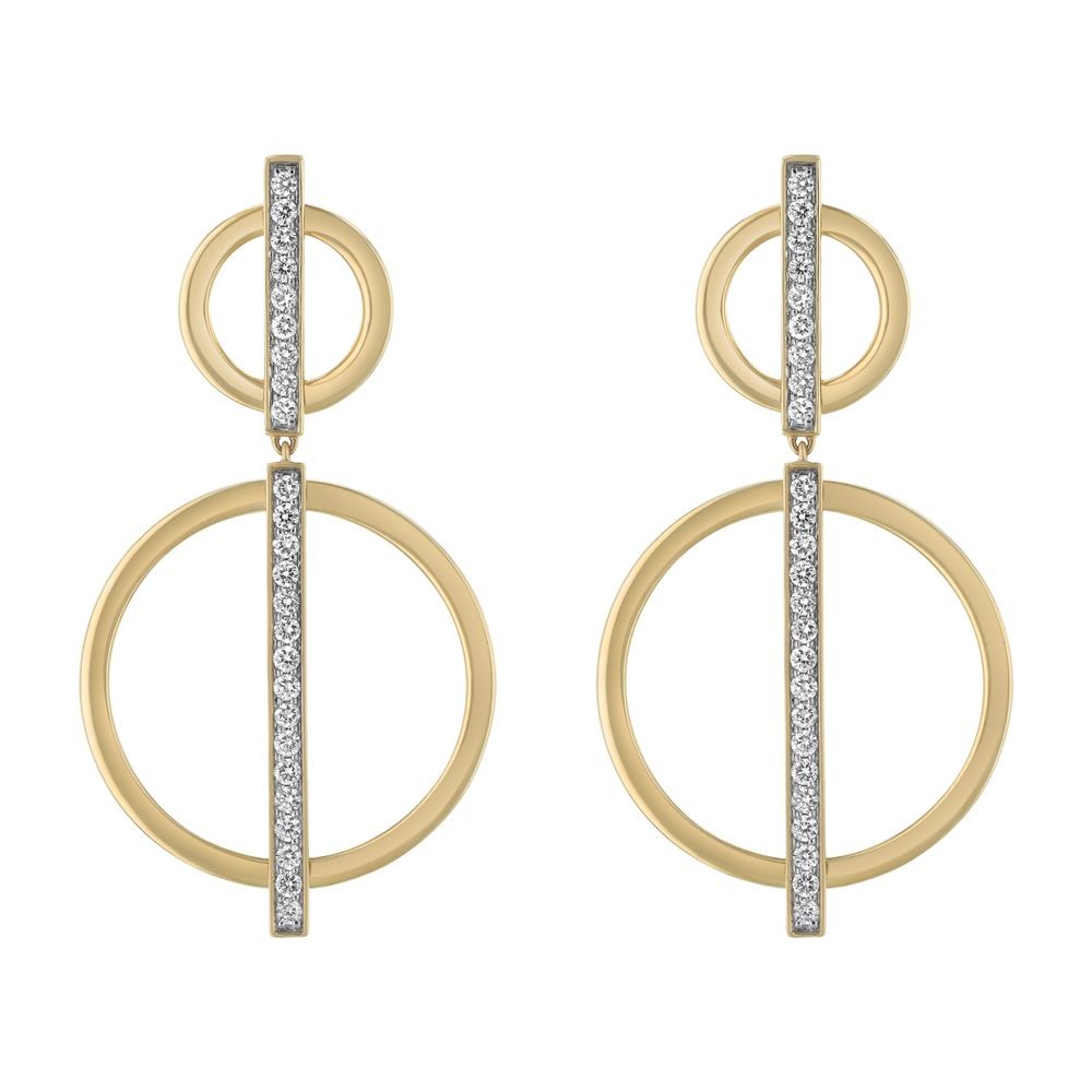 14K yellow gold geometric drop earrings set with 0.75 carat round brilliant diamonds in double circle design.