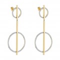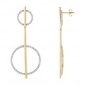 14K yellow gold geometric drop earrings set with 1 carat round brilliant diamonds in double circle design.