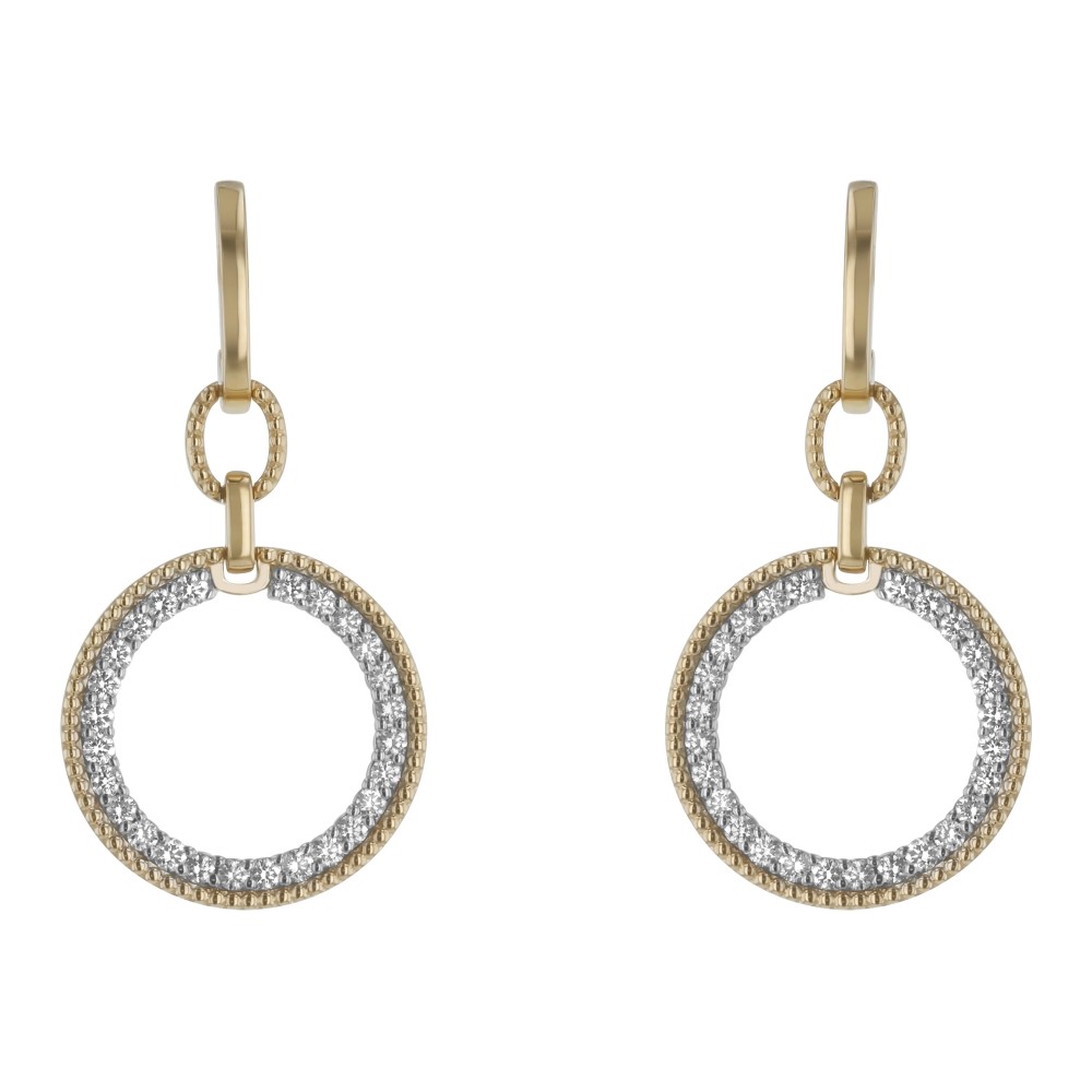 14K yellow gold circle shaped drop earrings set with 1.00 ct. white round diamonds and dangling from half hoops with post and pushback.