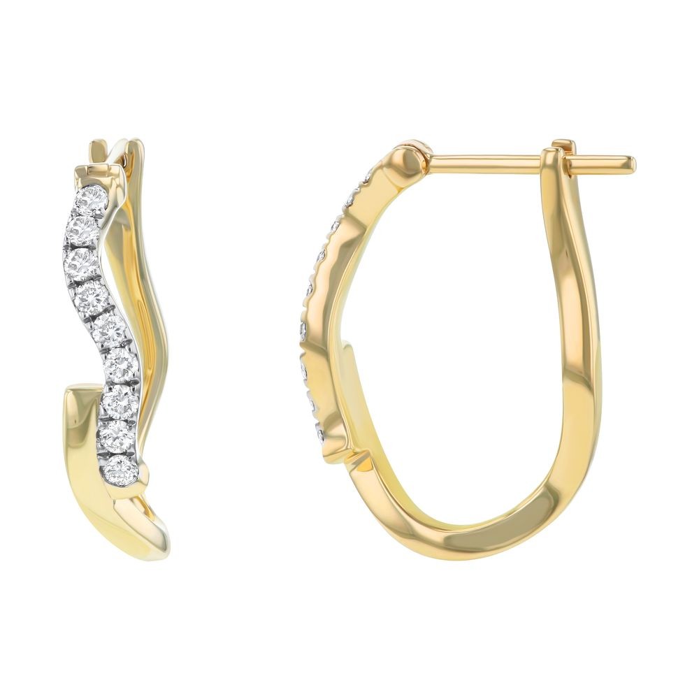 14K yellow gold hinged hoop earrings prong set with 0.33 ct. round diamonds in free form design.