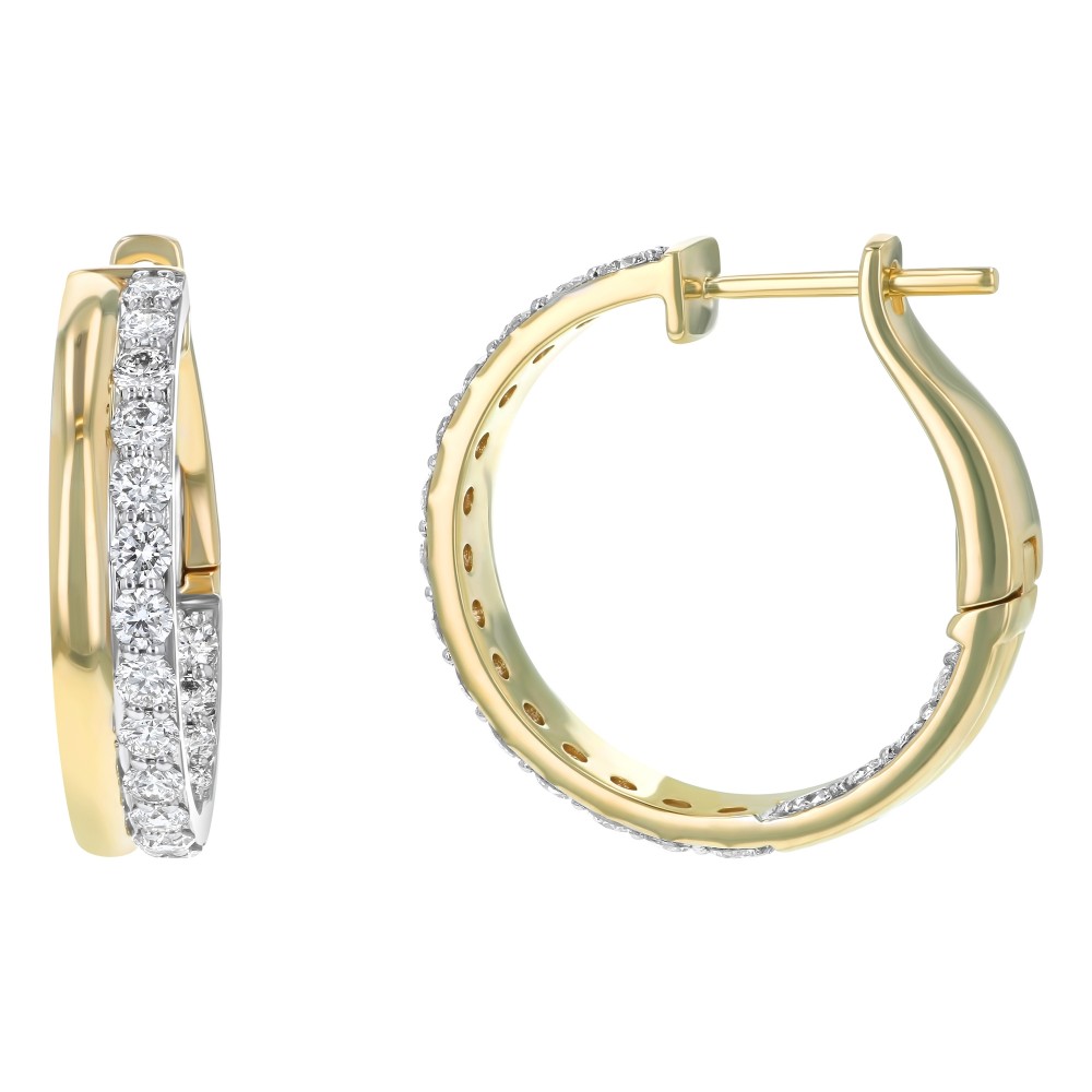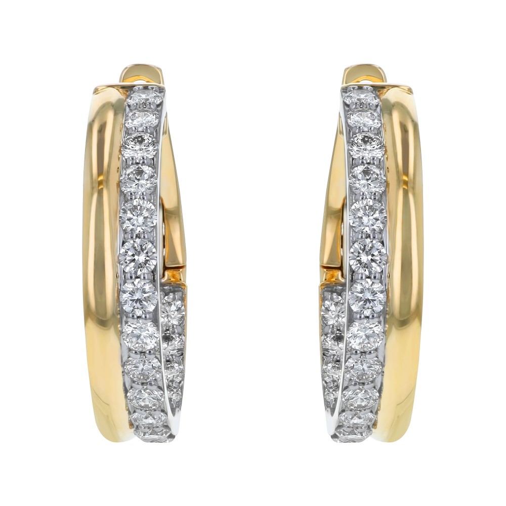 14K yellow gold two rows contemporary hoop earrings set with 1.15 ct. white brilliant diamonds.