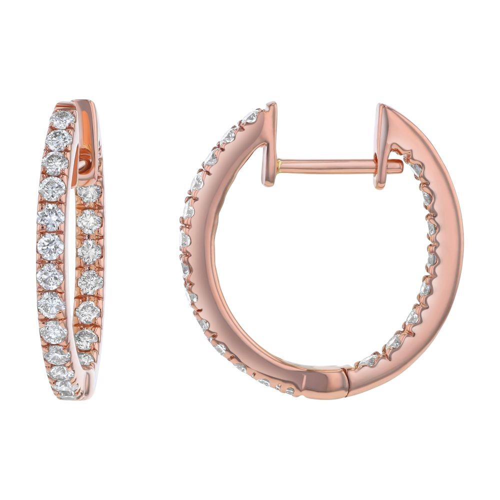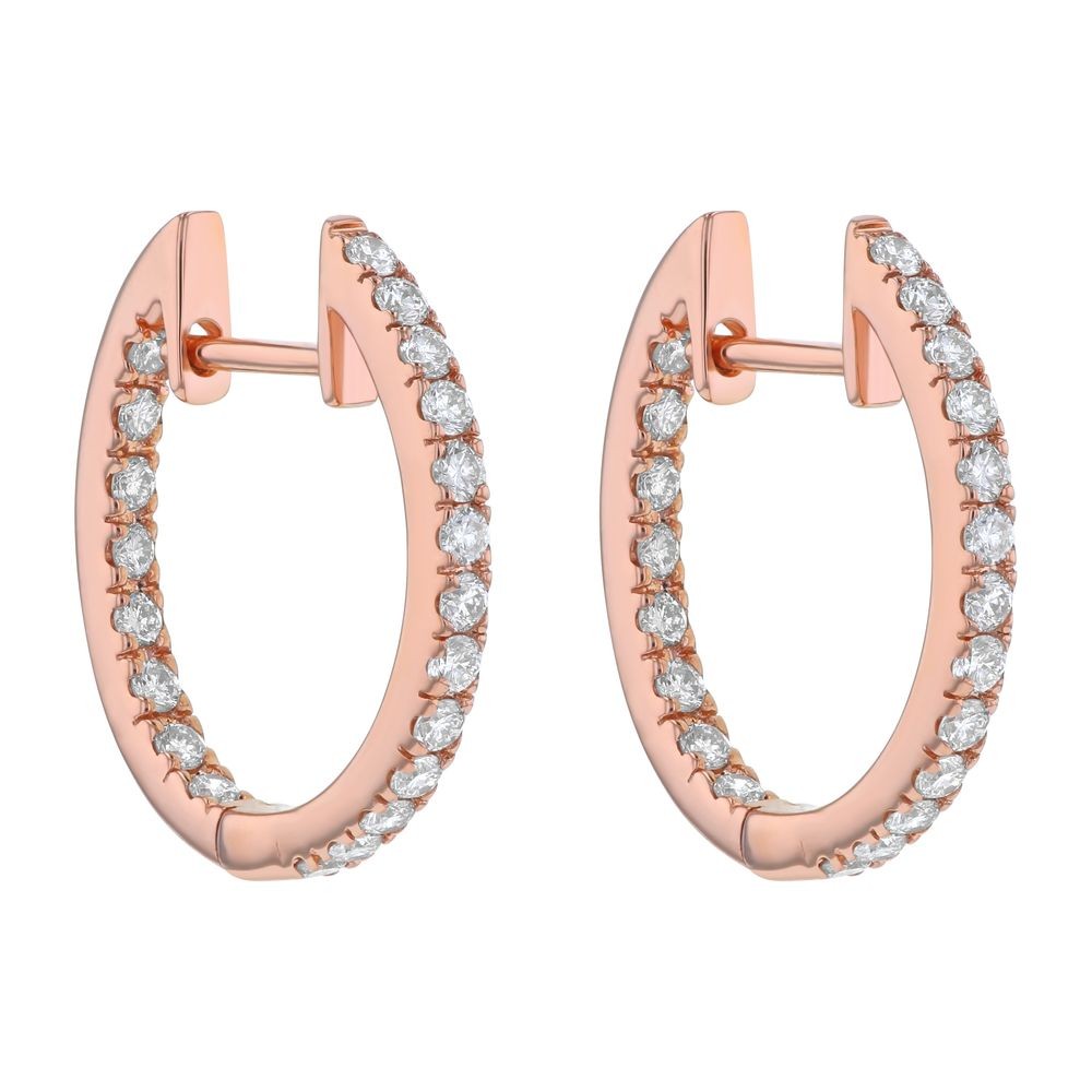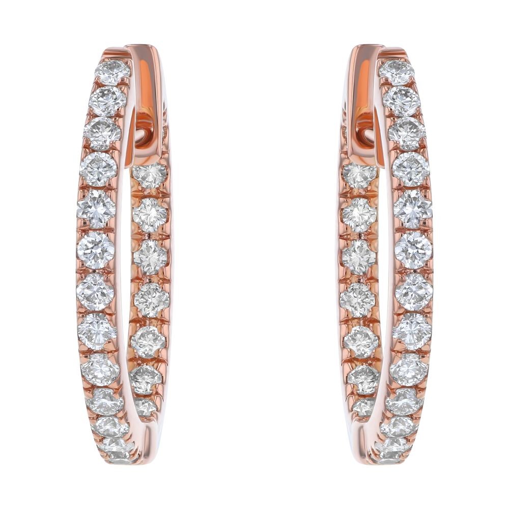 14K rose gold inside-out hoop earrings set with 0.50 ct. round diamonds in oval design.