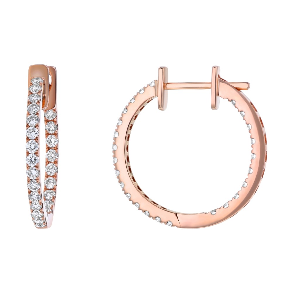 14K rose gold inside-out hoop earrings set with 1.00 ct. round diamonds in round design.