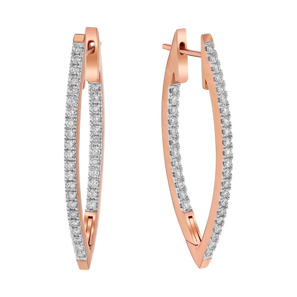14K rose gold inside-out hoop earrings set with 1.00 ct. round diamonds in V shape design.