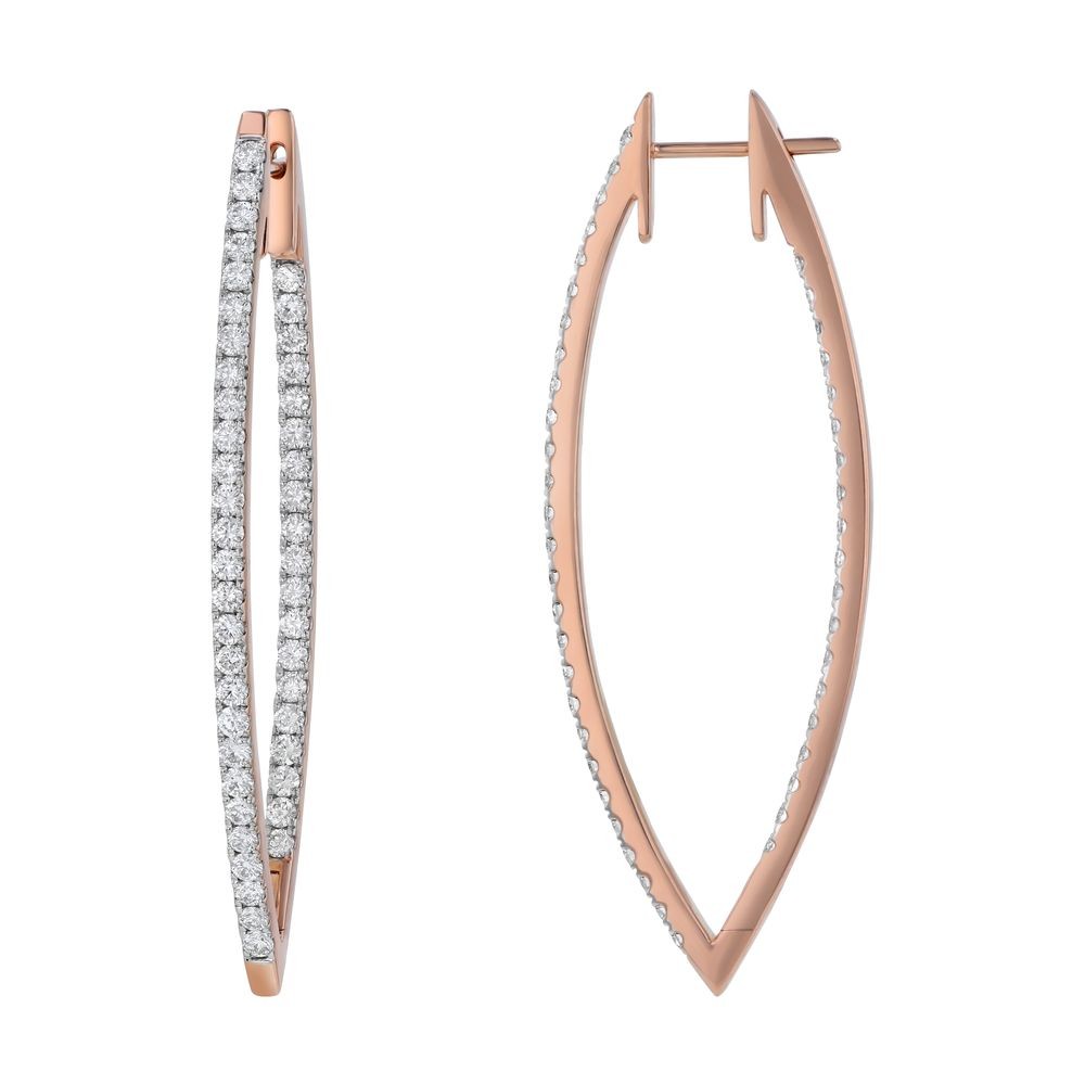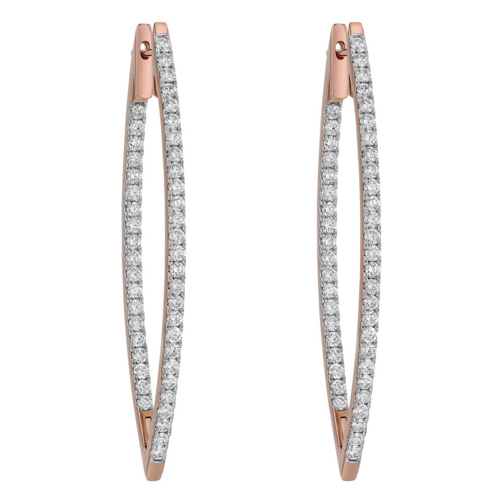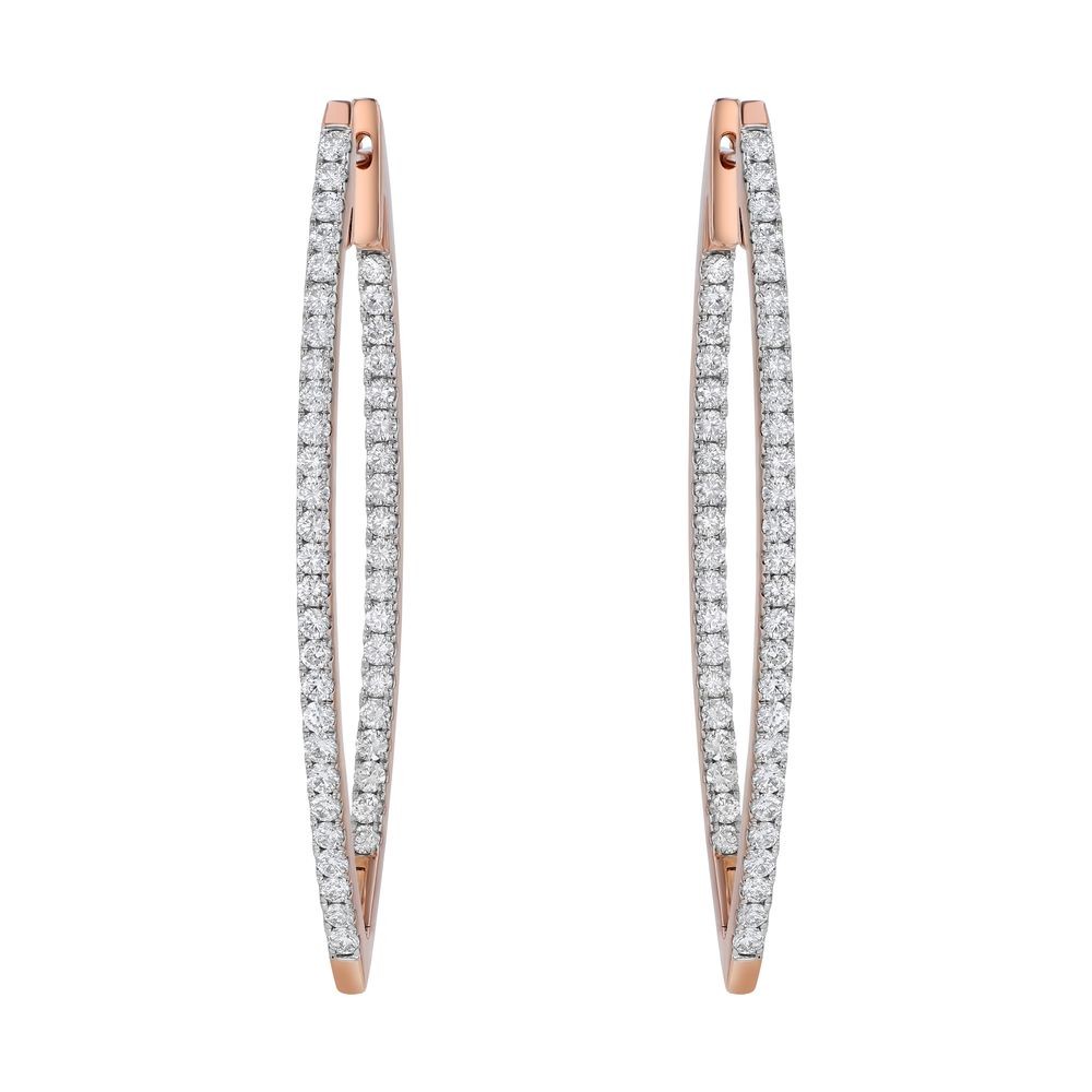 14K rose gold inside-out hoop earrings set with 3.00 ct. round diamonds in V shape design.