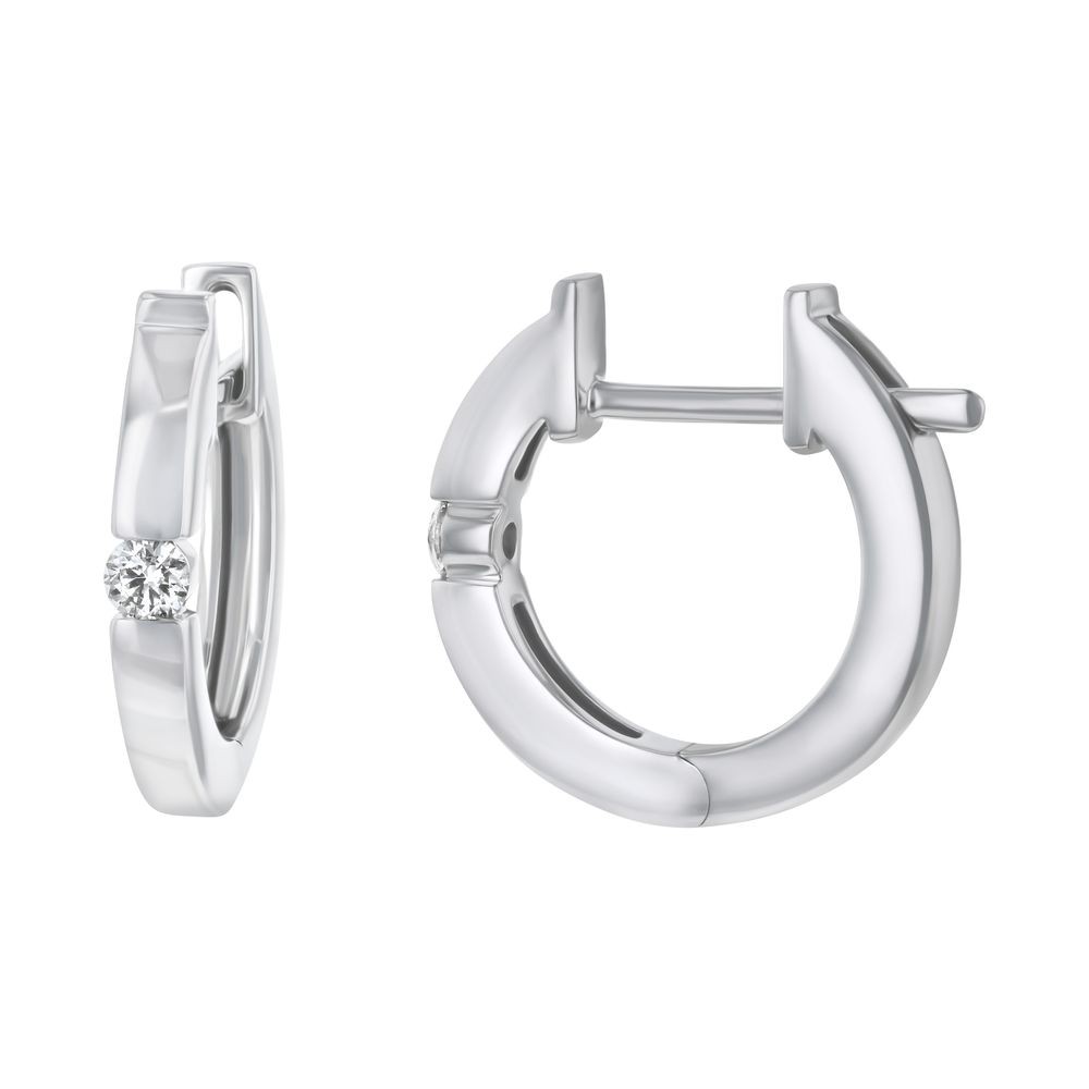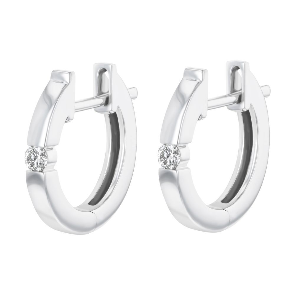 14K white gold hinged huggies hoop earrings tension set with 0.10 ct. round diamonds.