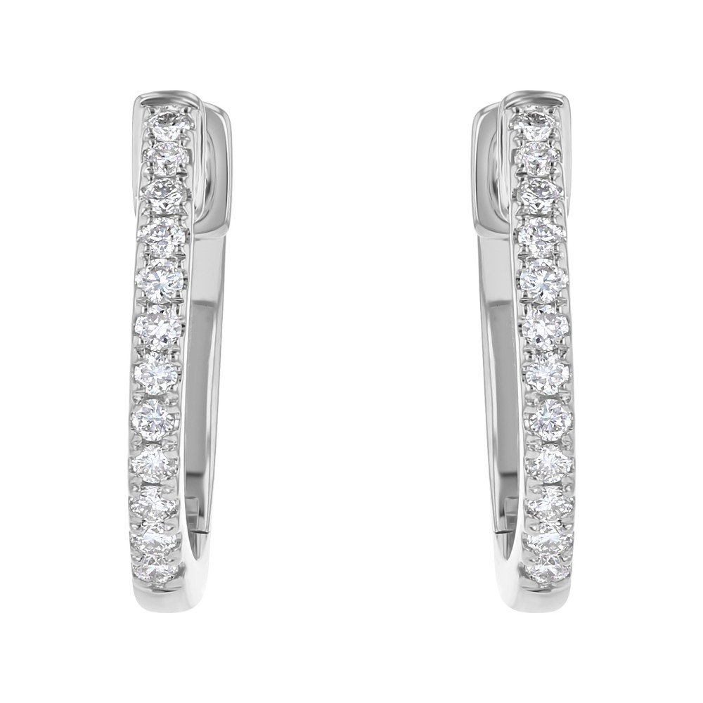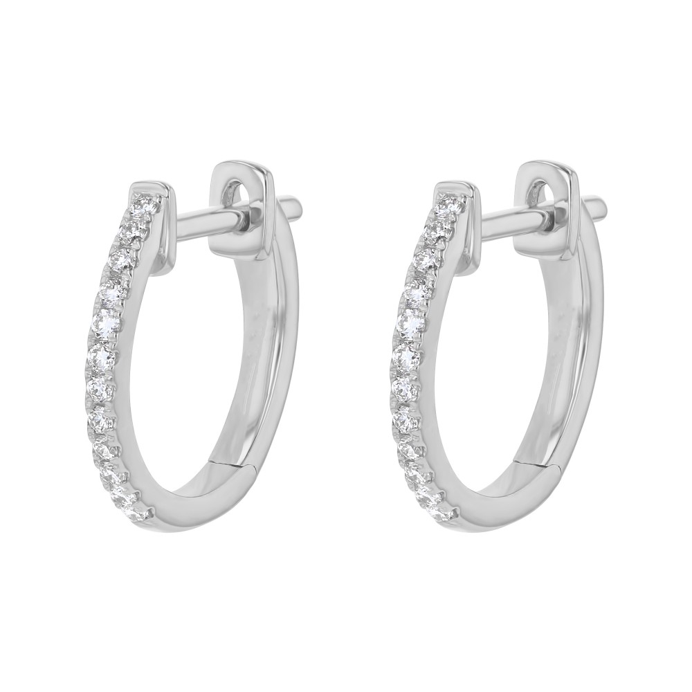 14K white gold hinged huggies hoop earrings tension set with 0.12 ct. round diamonds.
