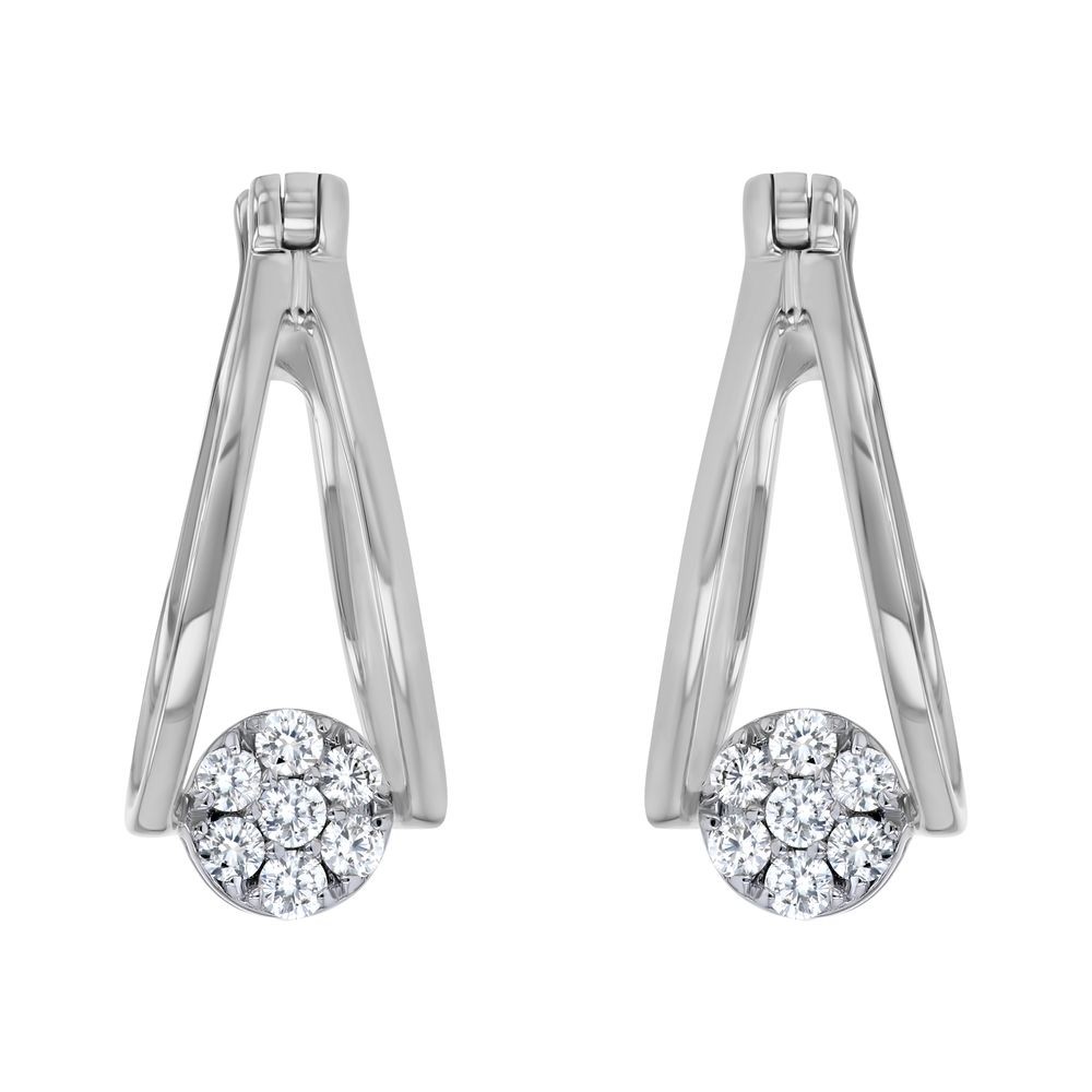 14K white gold huggie hoop earrings set with 0.25 carat diamonds. The hoop earrings are secured with snap in bar.