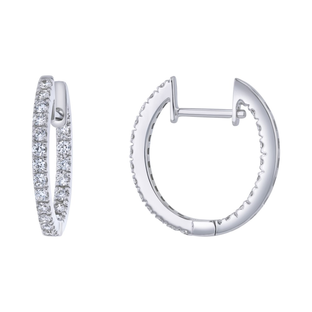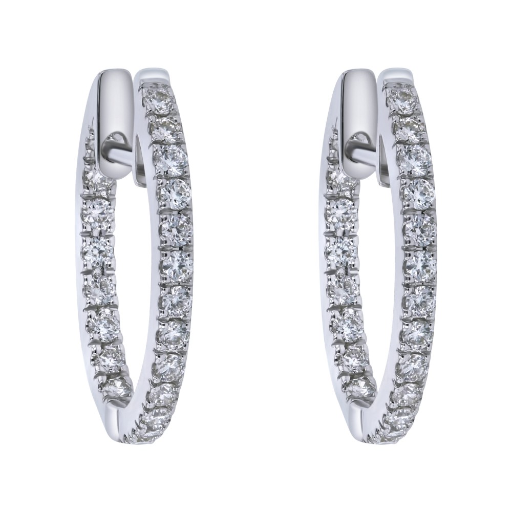 14K white gold inside-out hoop earrings set with 0.50 ct. round diamonds in oval design.