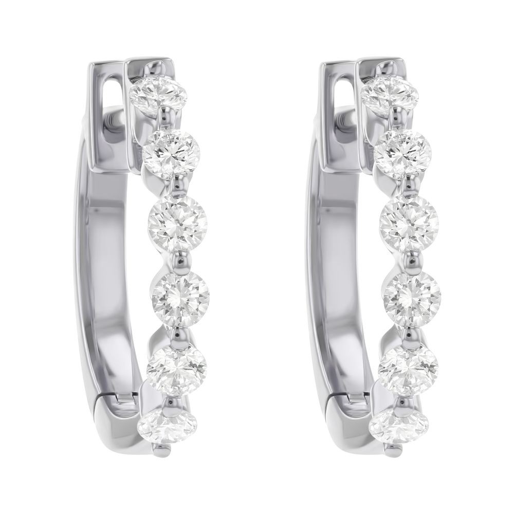 14K white gold shared prong hinged hoop earrings set with 0.50 ct. round diamonds in oval design.