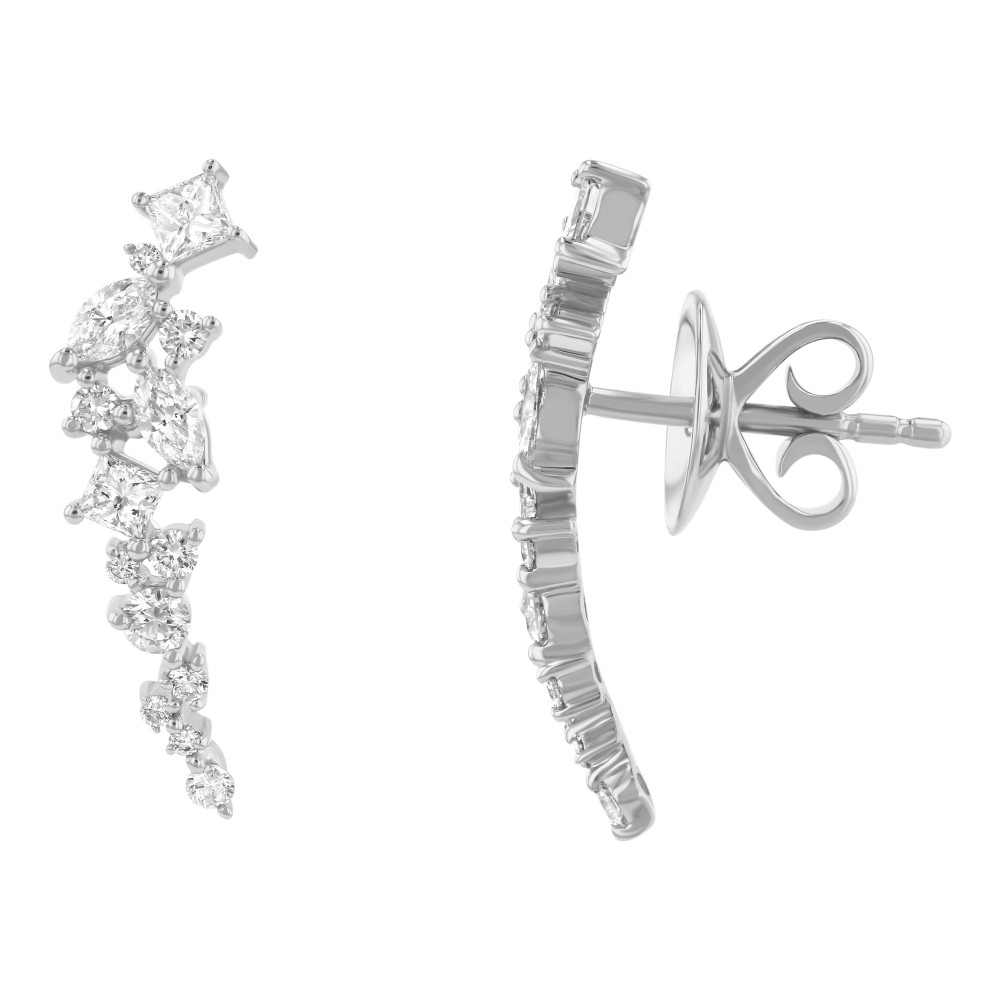 14K white gold ear climber style earrings set with 0.75 ct. princess, marquise and round diamonds. Part of our Ear Climbers collection.