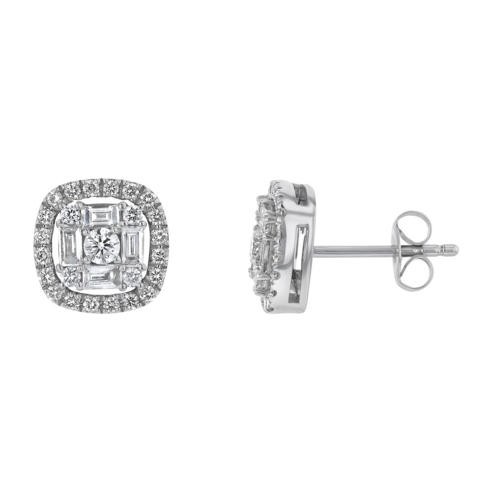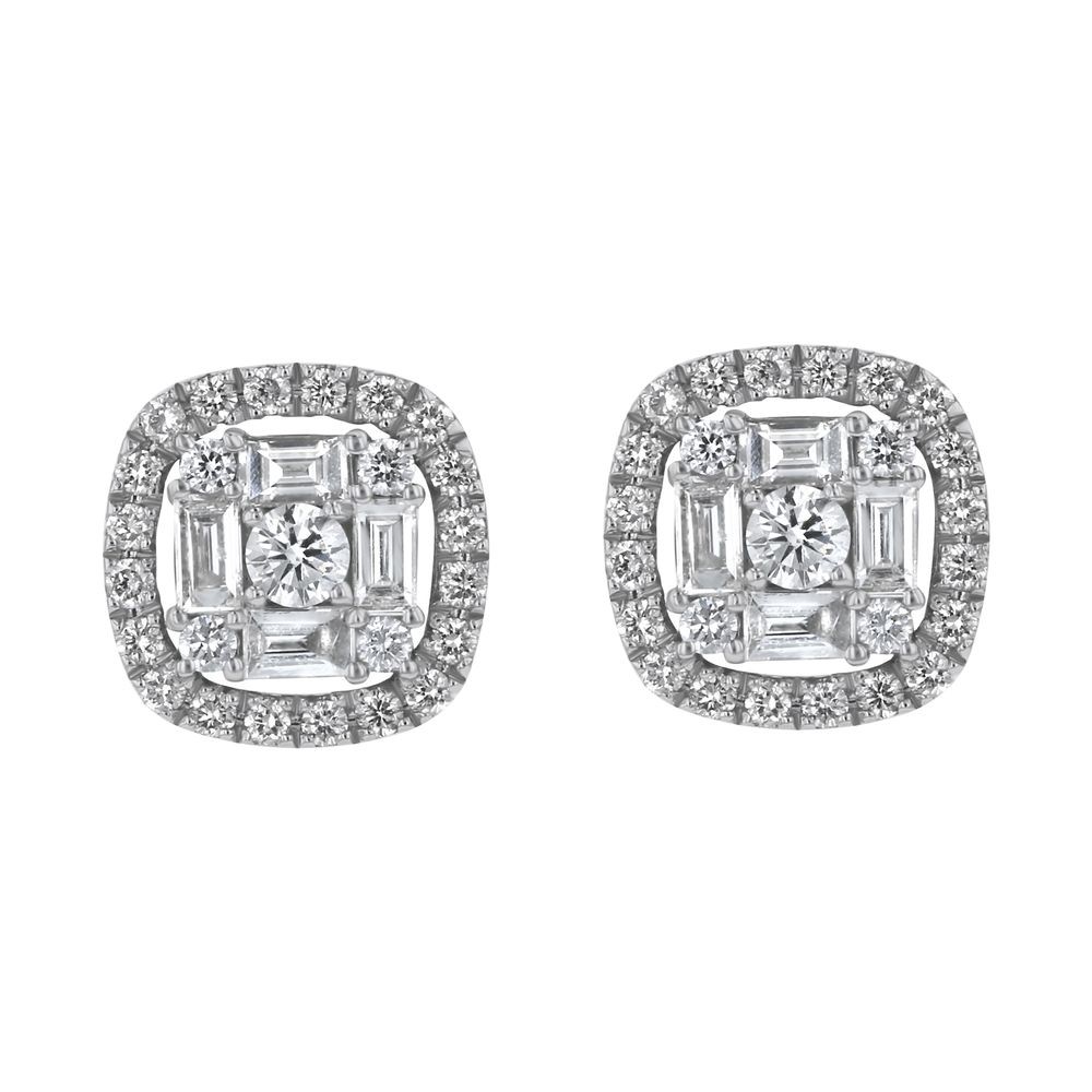 14K white gold stud earrings set with 0.75 ct. baguette and round diamonds in halo cushion design.