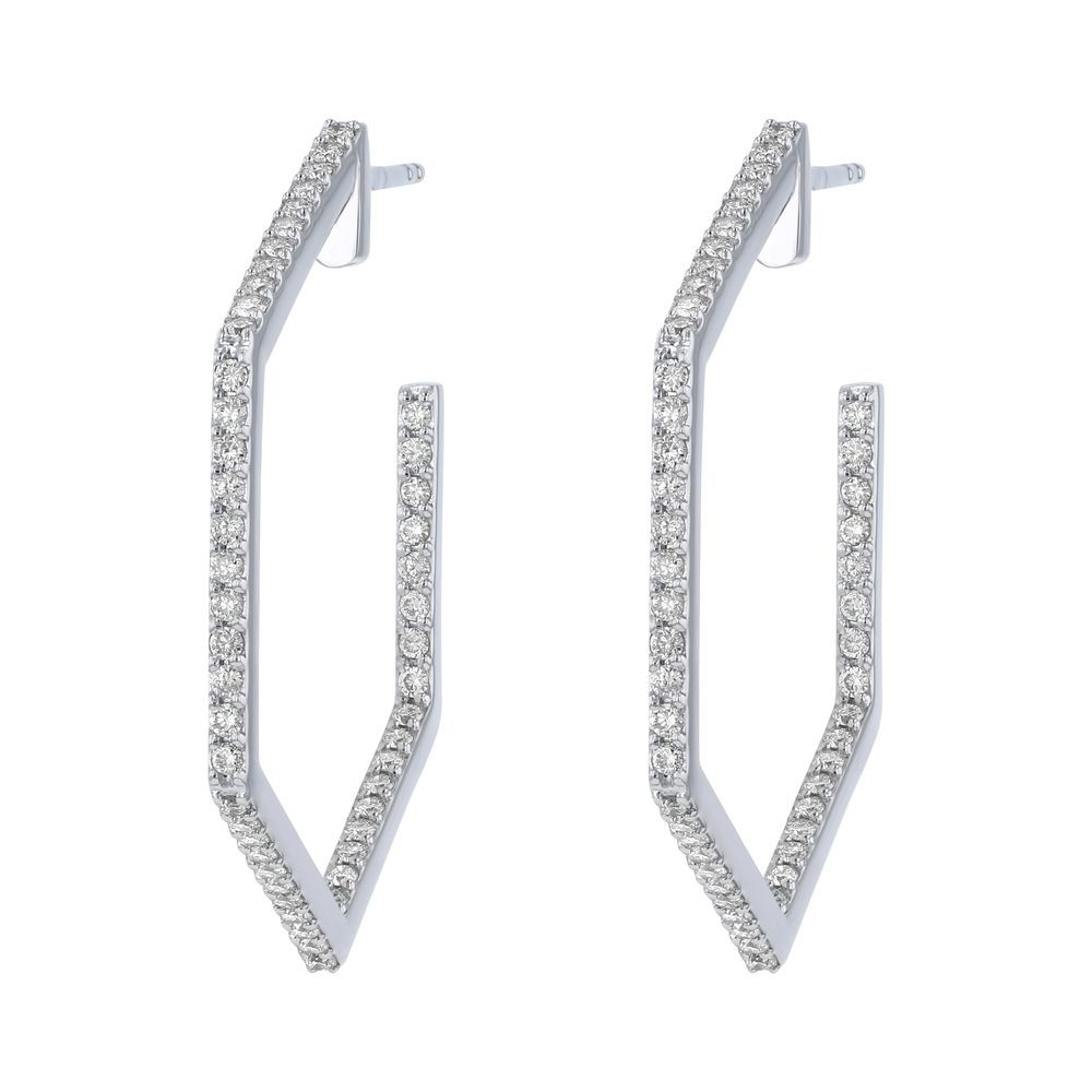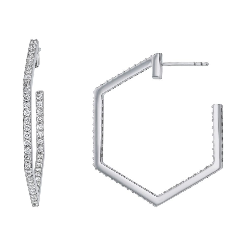 14K white gold hexagon shape earrings set with 1.00 ct. round diamonds in inside-out pattern
