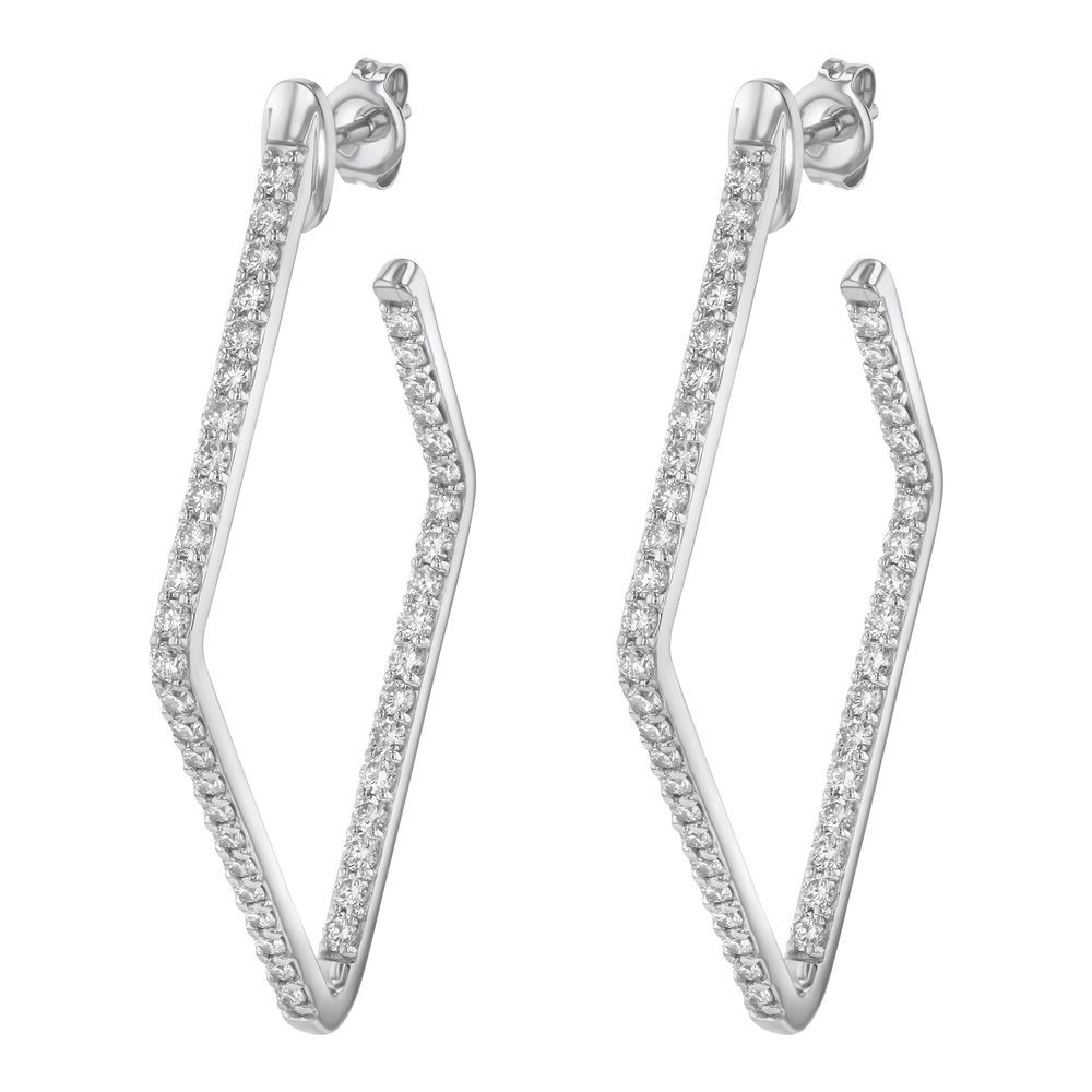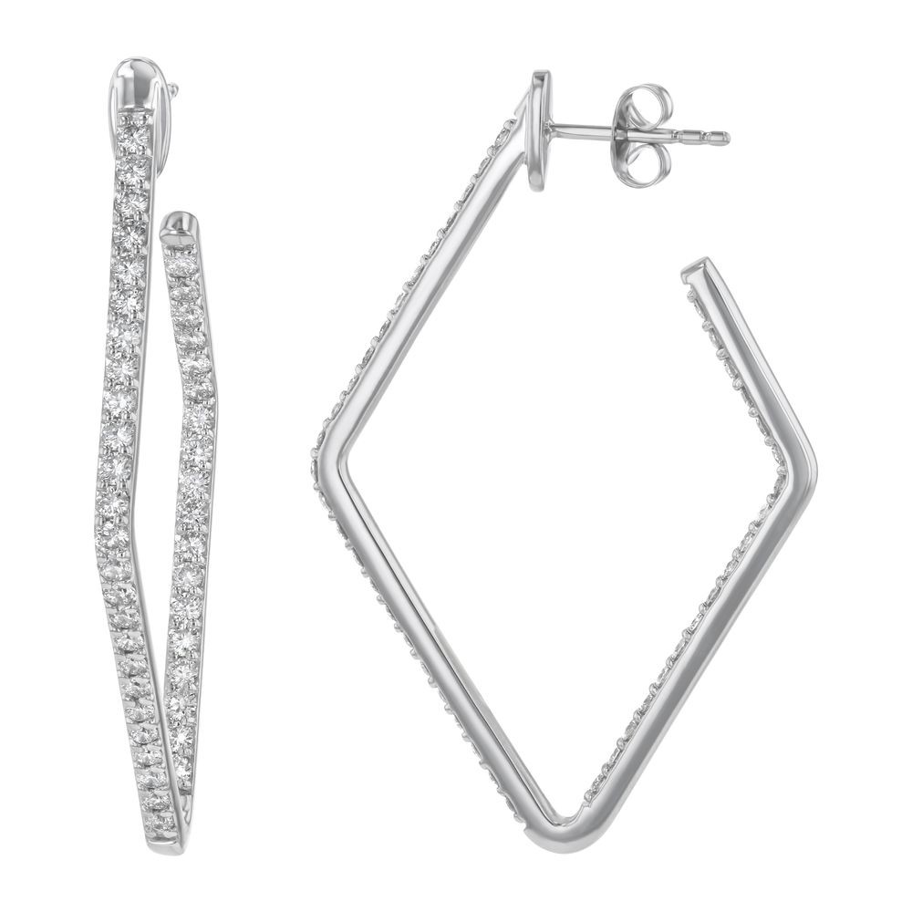 14K white gold rhombus shape earrings set with 1.00 ct. round diamonds in inside-out pattern