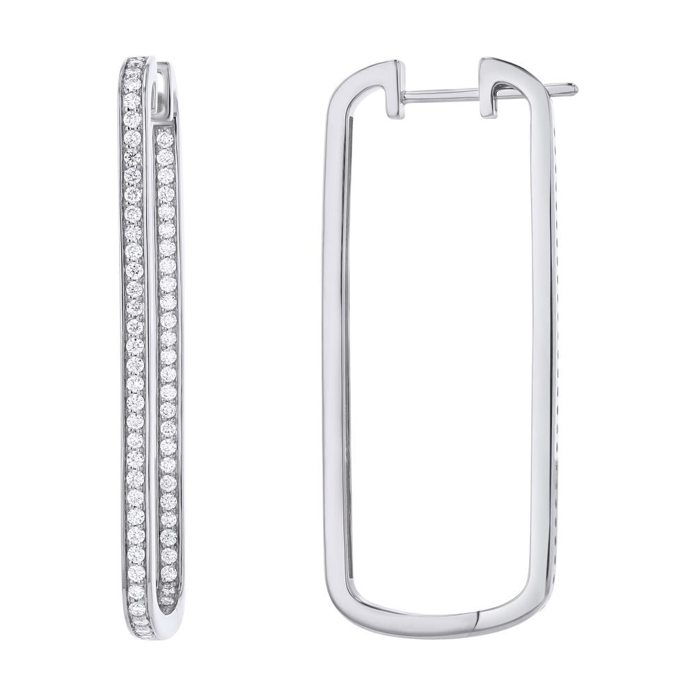 14K white gold rectangle shape contemporary hoop earrings set with 1.00 ct. diamonds in inside-out design