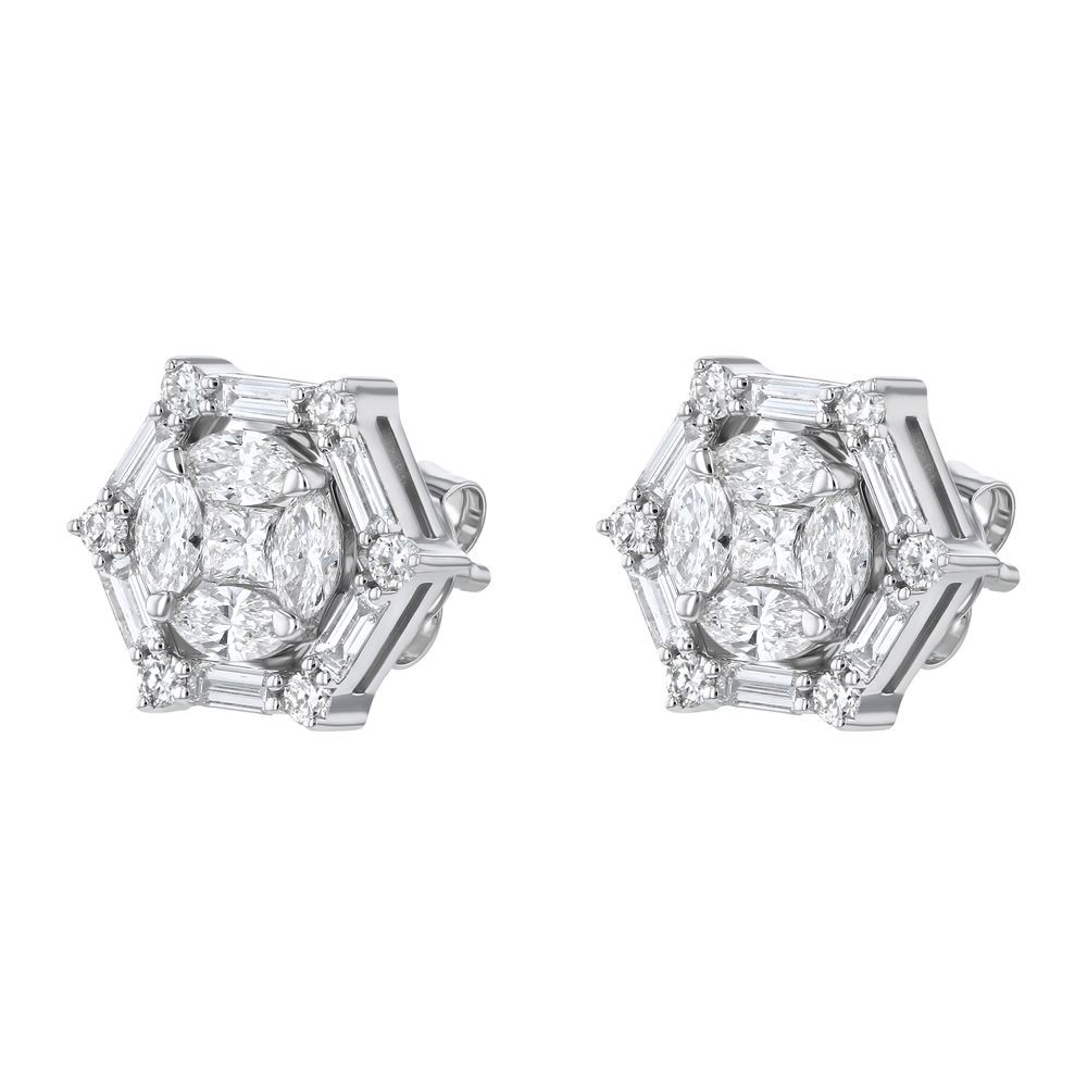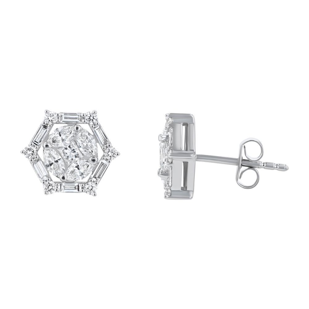14K white gold stud earrings set with 1.1 ct. baguette, princess, marquise and round diamonds in halo pentagon design.