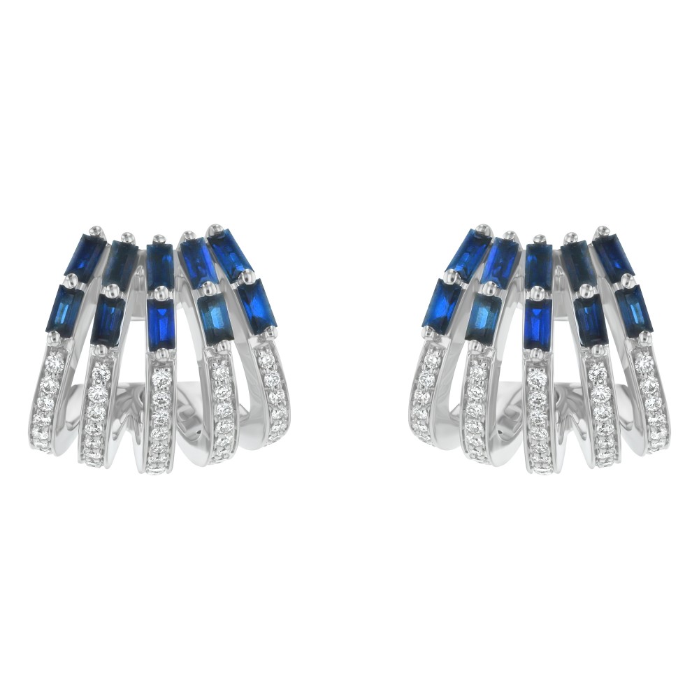 14K white gold ear wrap style earrings set with 0.50 ct. round diamonds and 1.15 ct. baguette blue sapphires. The sapphires are natural, heat treated.