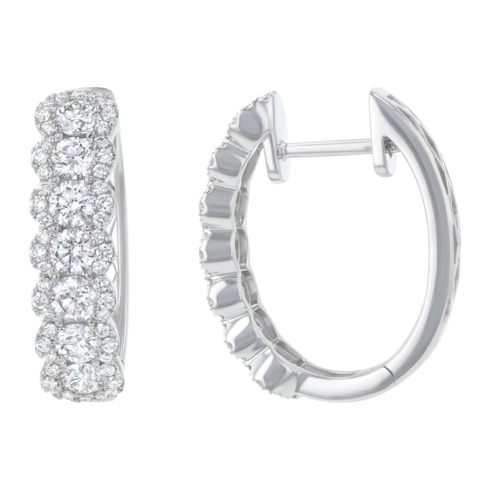 14K white gold oval shape hoop earrings set with 1.75 ct. round diamonds.