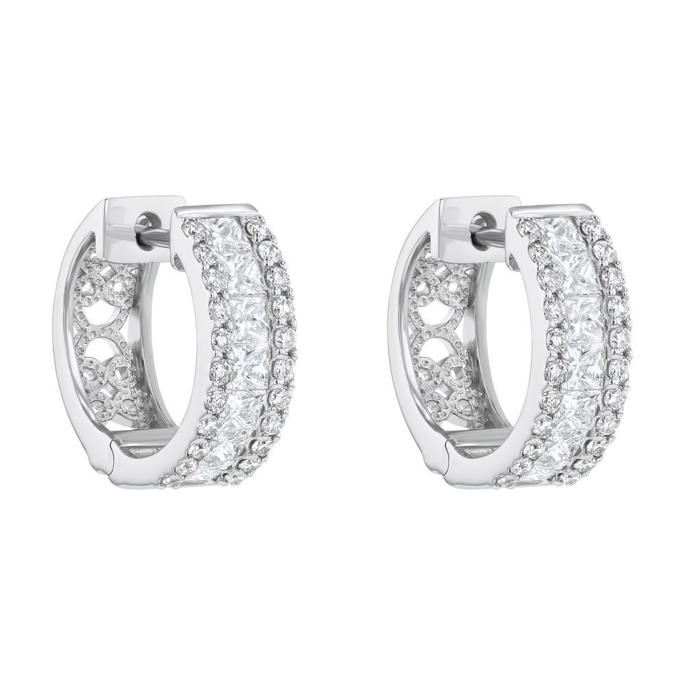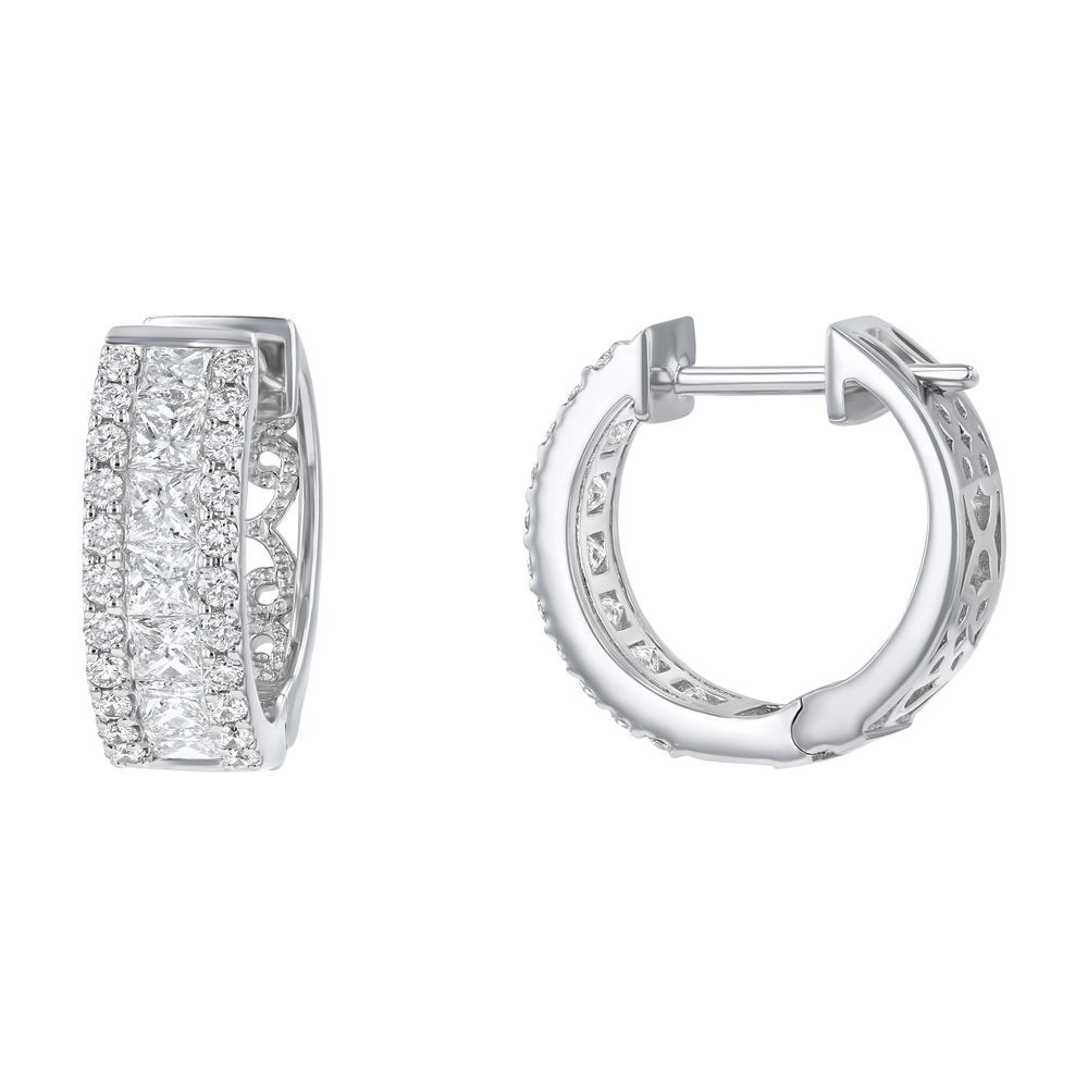 14K white gold hinged hoop earrings set with 1.90 ct. princess and round diamonds.