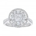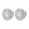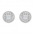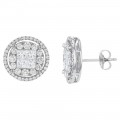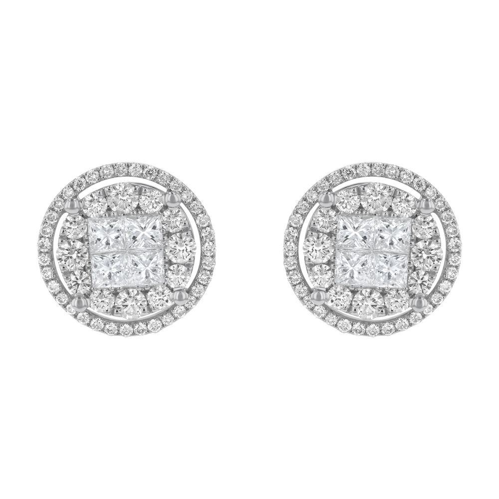 14K white gold stud earrings set with 2.0 ct. princess and round diamonds in double halo round design.