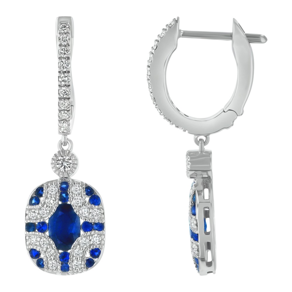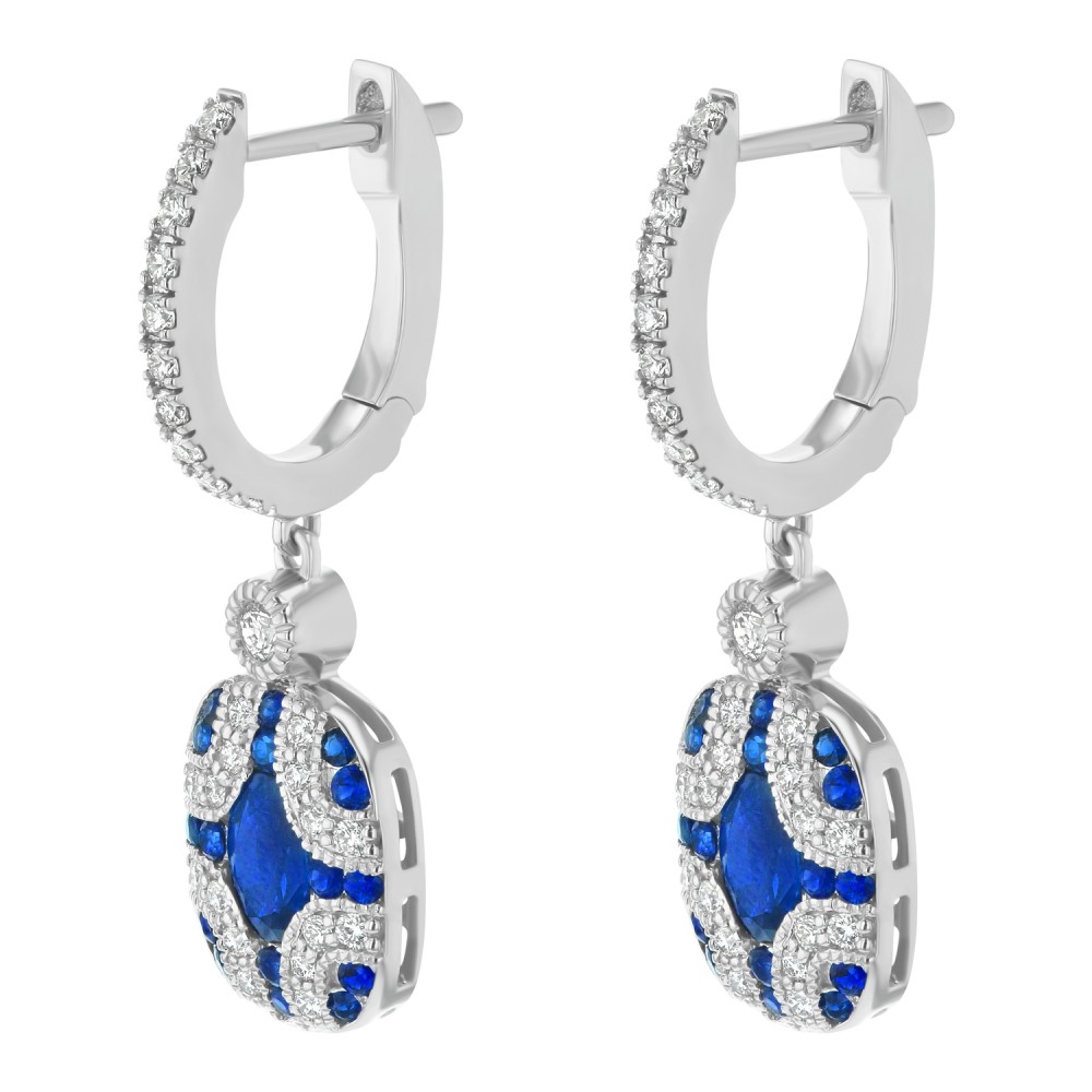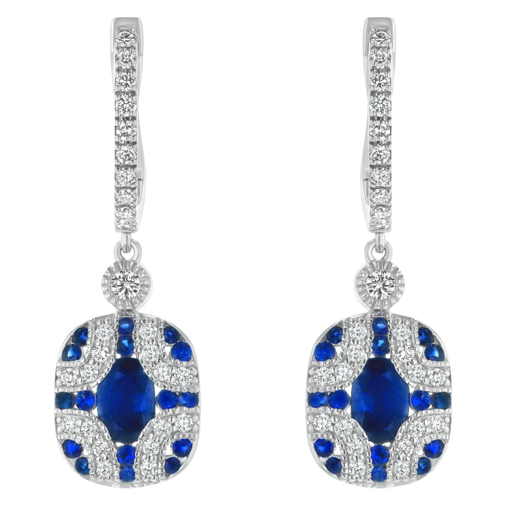 14K white gold art deco drop earrings set with 0.60 ct. round brilliant diamonds and 1.70 ct. oval and round blue sapphires.