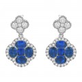 14K white gold dangle drop earrings set with 0.55 ct. round brilliant diamonds and 2.00 ct. oval and princess blue sapphires. The sapphires are natural, heat treated.