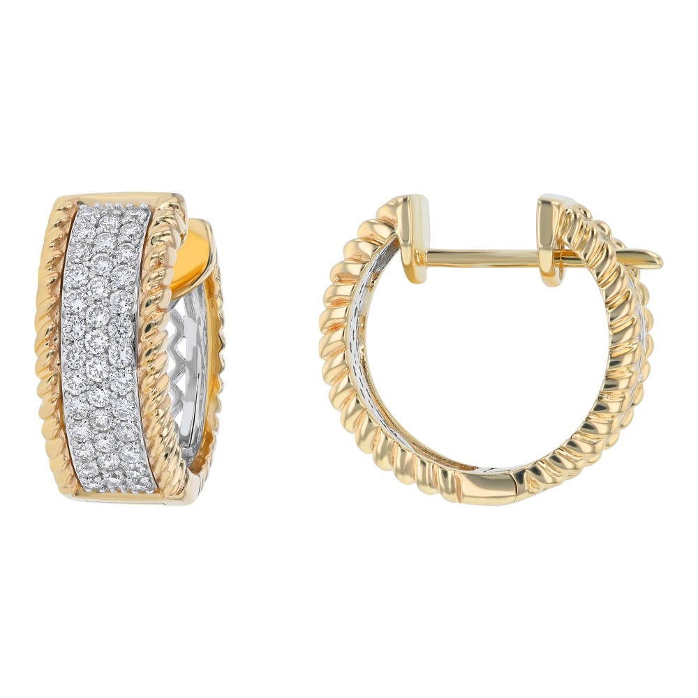 14K yellow and white gold huggies hoop earrings set with 0.70 ct. round white diamonds in braids design.