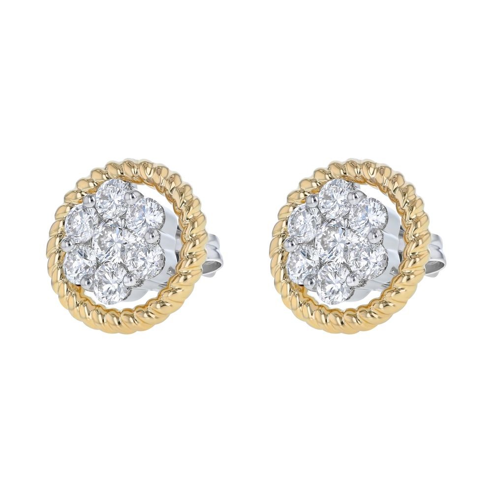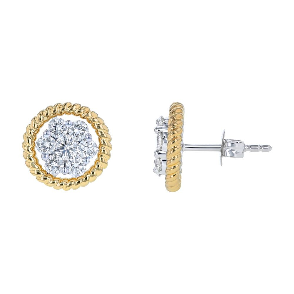 14K yellow and white gold stud earrings set with 1 ct. round diamonds in flower cluster design and braided frame.