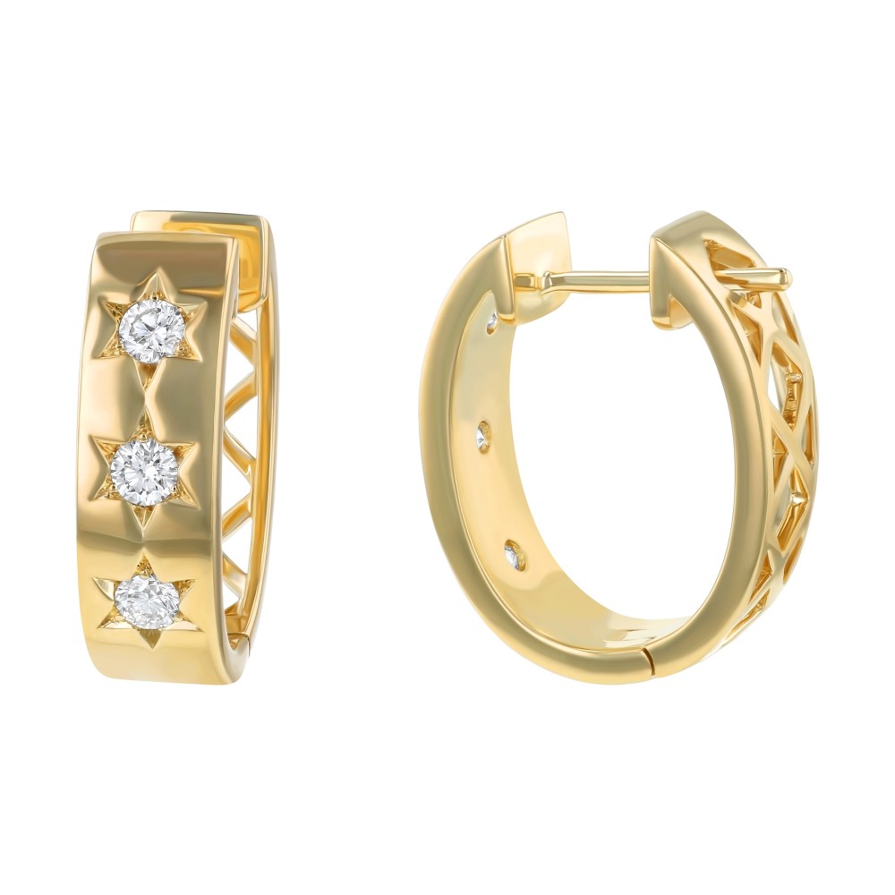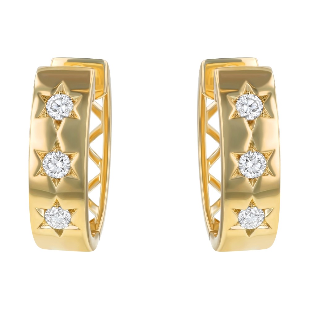 14K yellow gold star engraved contemporary hoop earrings set with 0.45 ct. white brilliant diamonds.