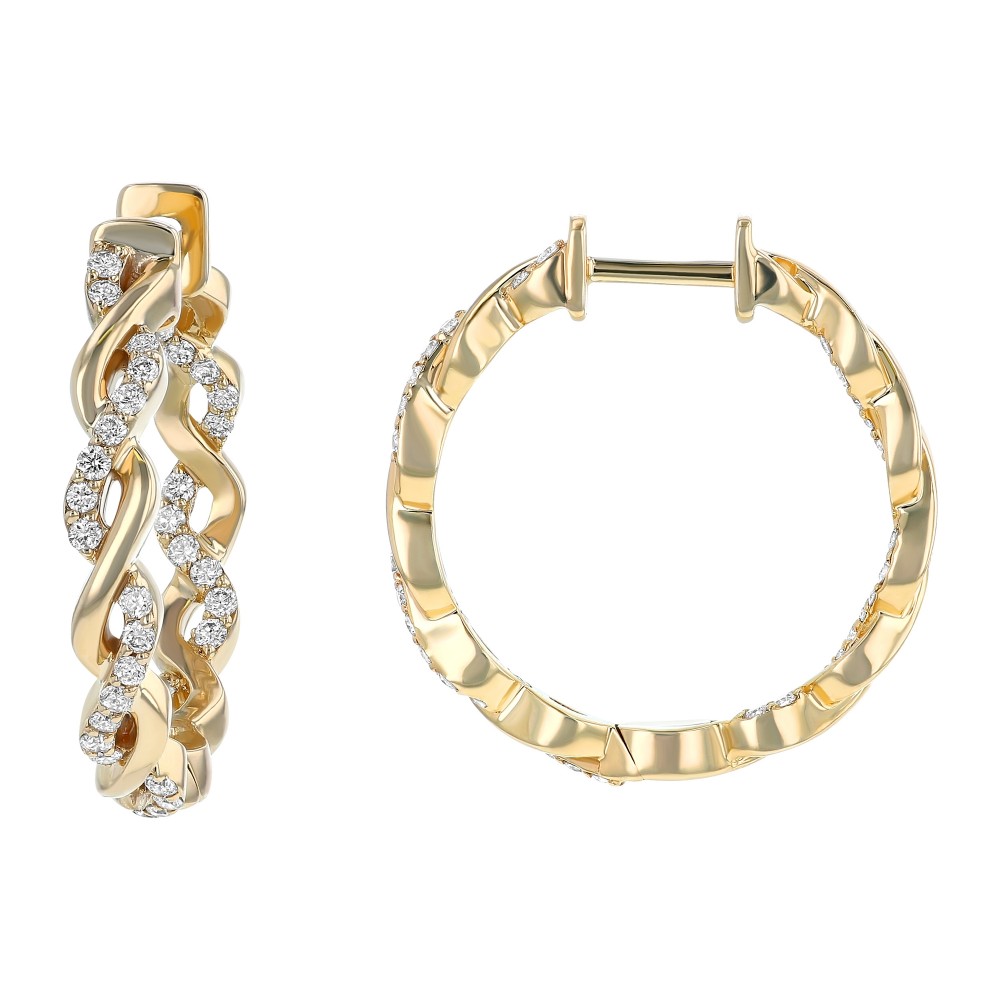 14K yellow gold hoop earrings set inside and outside with 0.45 ct. round diamonds in infinity design.